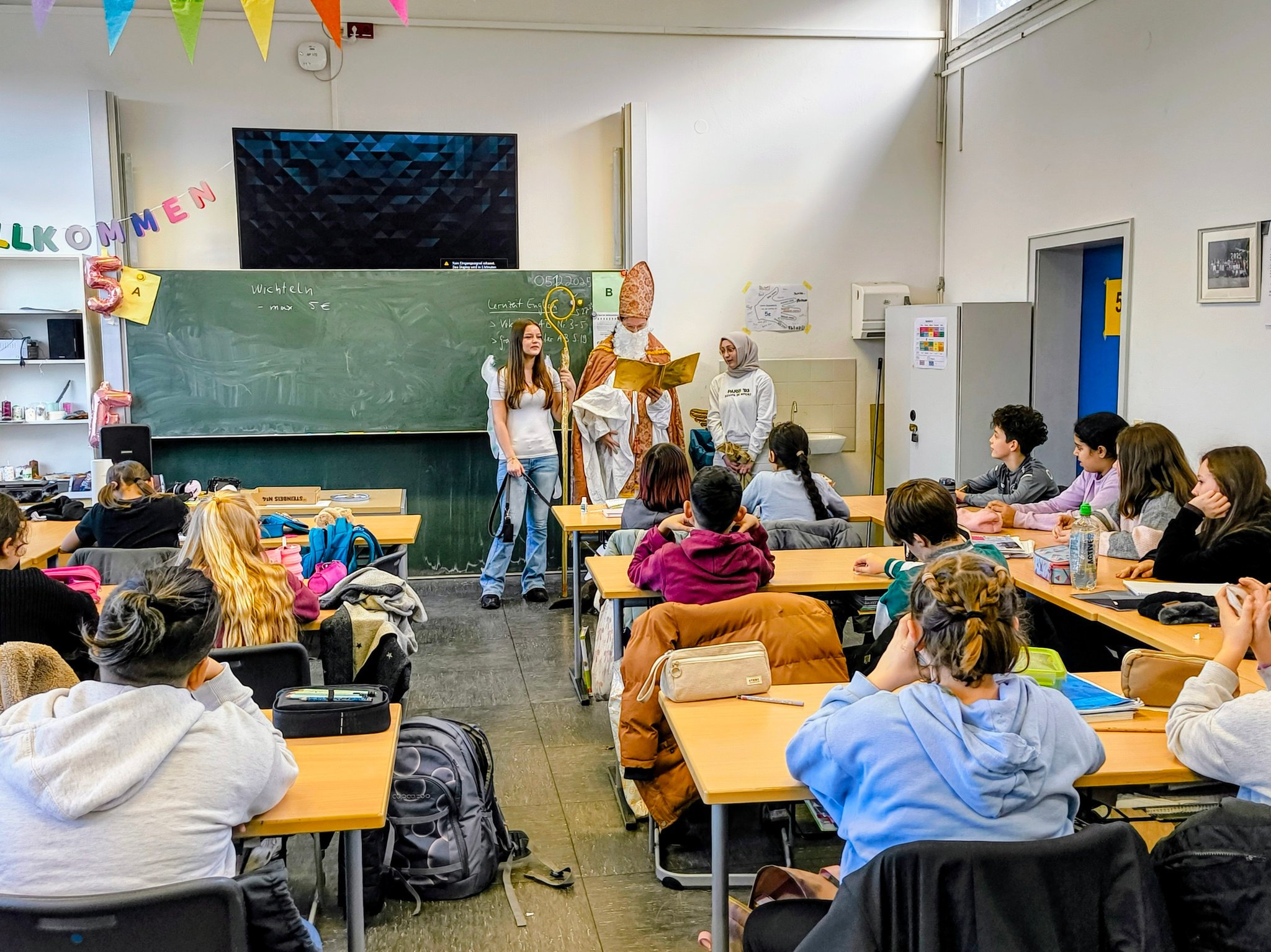 Auch in diesem Jahr kam der Nikolaus wieder in die Waldschule und beschenkte die Schülerinnen und Schüler des fünften Jahrgangs. Die Paten des Pädagogik-Ergänzungskurses des 10. Jahrgangs und der Schulhund Abby kamen als Nikolaus und Engel verkleidet in die Klassen und brachten die von den Klassenlehrerinnen und Klassenlehrer organisierten Süßigkeiten. Die Schülerinnen und Schüler des fünften Jahrgangs freuten sich sehr über den Besuch.