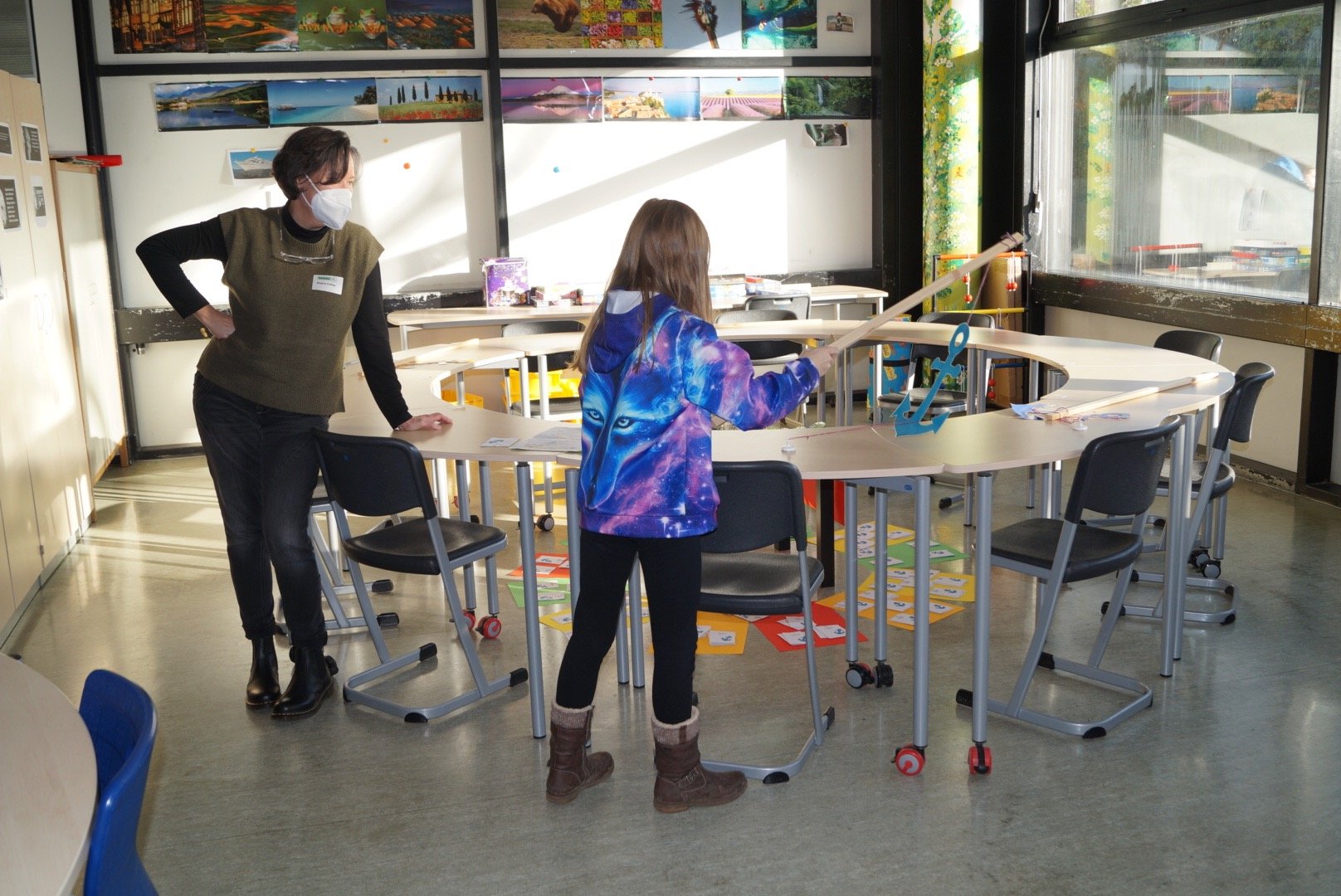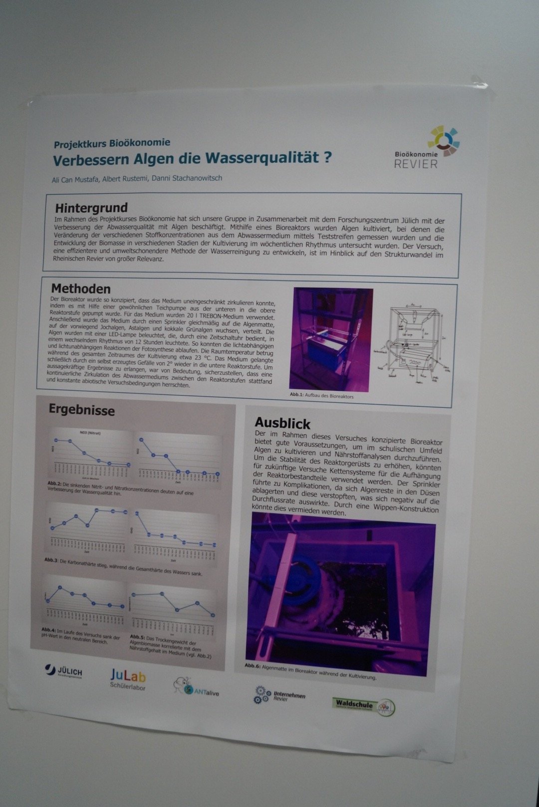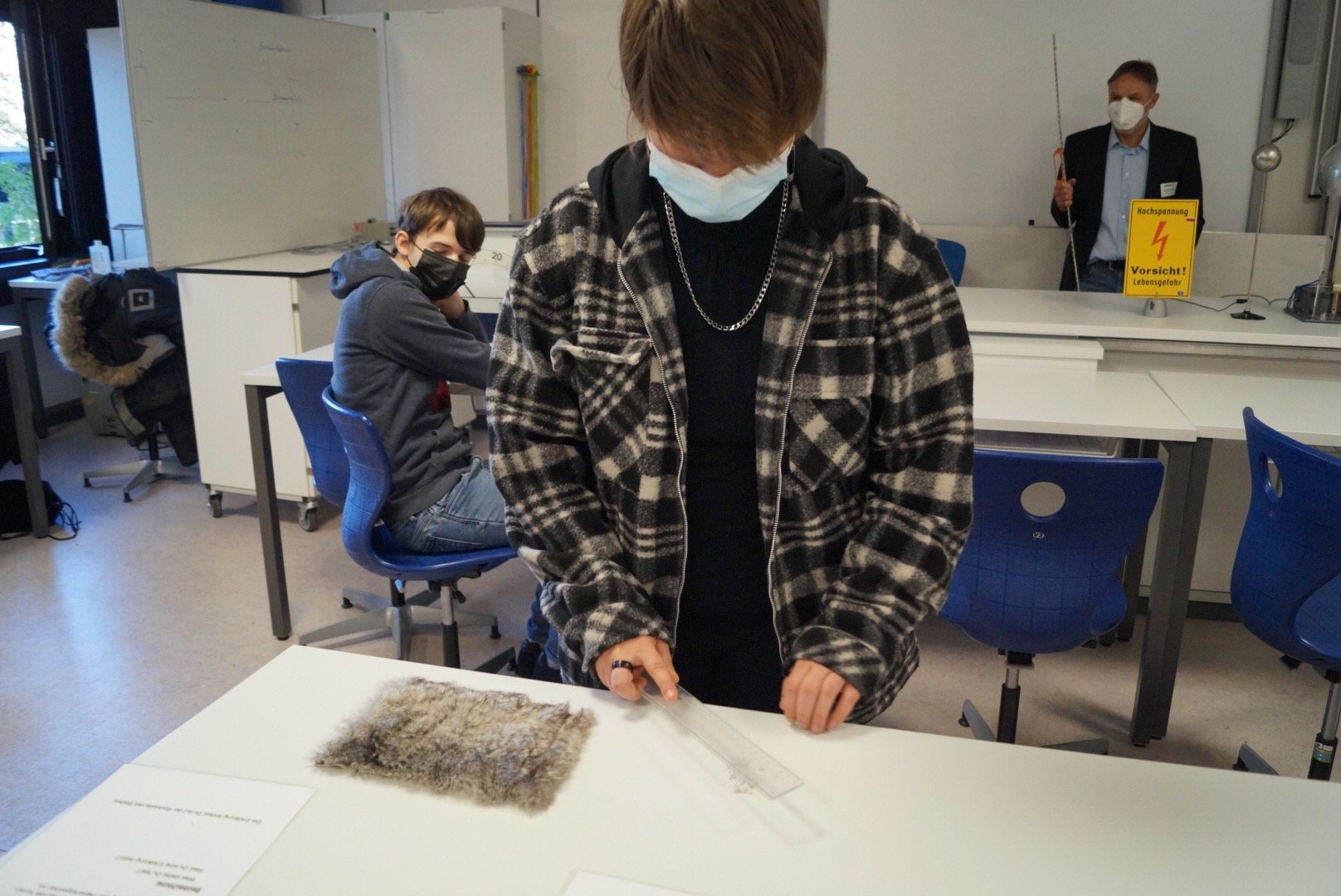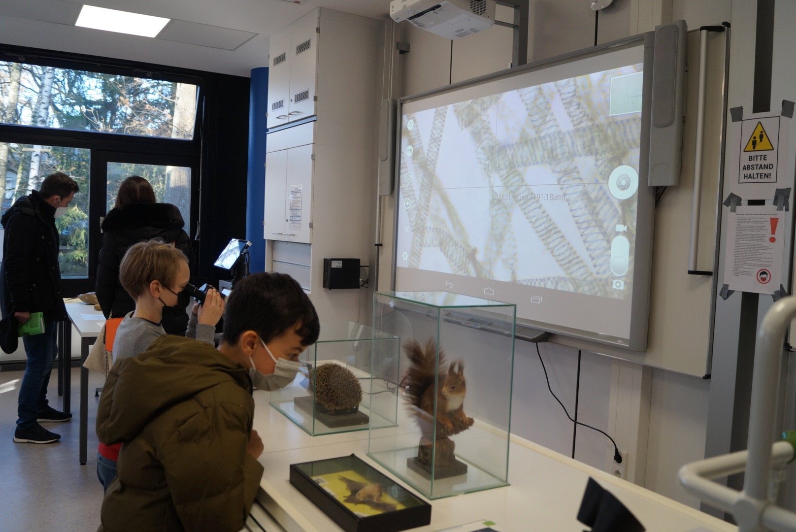 Neben den Führungen und der Schnitzeldjagd gab es für die Schüler:innen der 4. Klassen aber auch zahlreiche Angebote zum Mitmachen. Im Technikraum wurden Nikoläuse ausgesägt, bei der Hauswirtschaft gab es ein Zucker-Schätzspiel, in der Chemie und der Physik konnten die Kinder eigenständig Experimente durchführen. Außerdem konnten sie Biene Elsa kennenlernen, unser Schulmaskottchen, das zum digitalen Rundflug einlud. In einem weiteren Angebot zeigten die Teilnehmer:innen des Bienenprojekts, wie unser Schulhonig entsteht. Für die Oberstufenschüler:innen dürfte auch die Präsentation des Projektkurses Bioökonomie beeindruckend gewesen sein: die Schüler:innen erforschen, wie man Algen als Textilfarbstoff, zur Filterung von Mikroplastik oder als Brennstoff nutzen könnte.