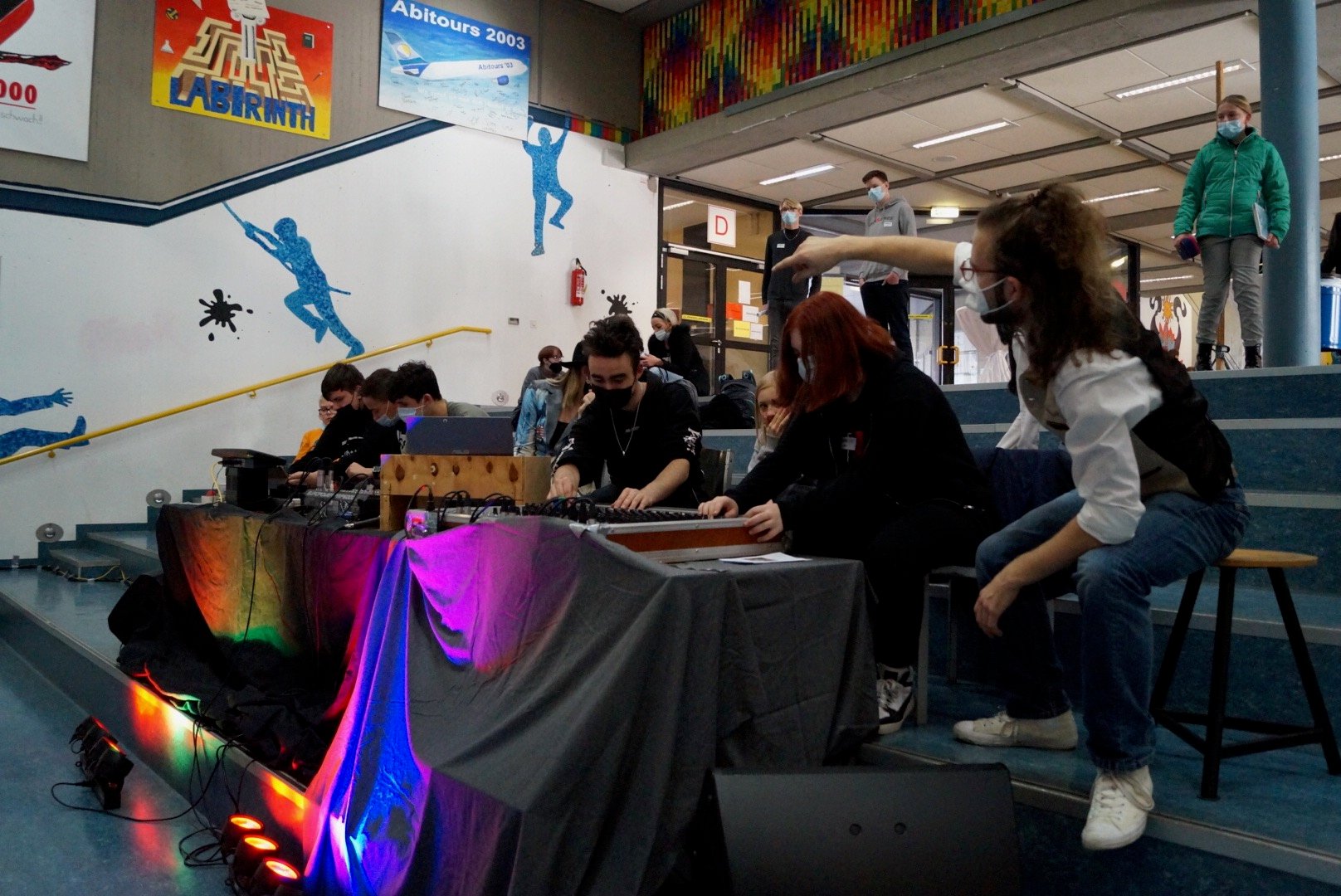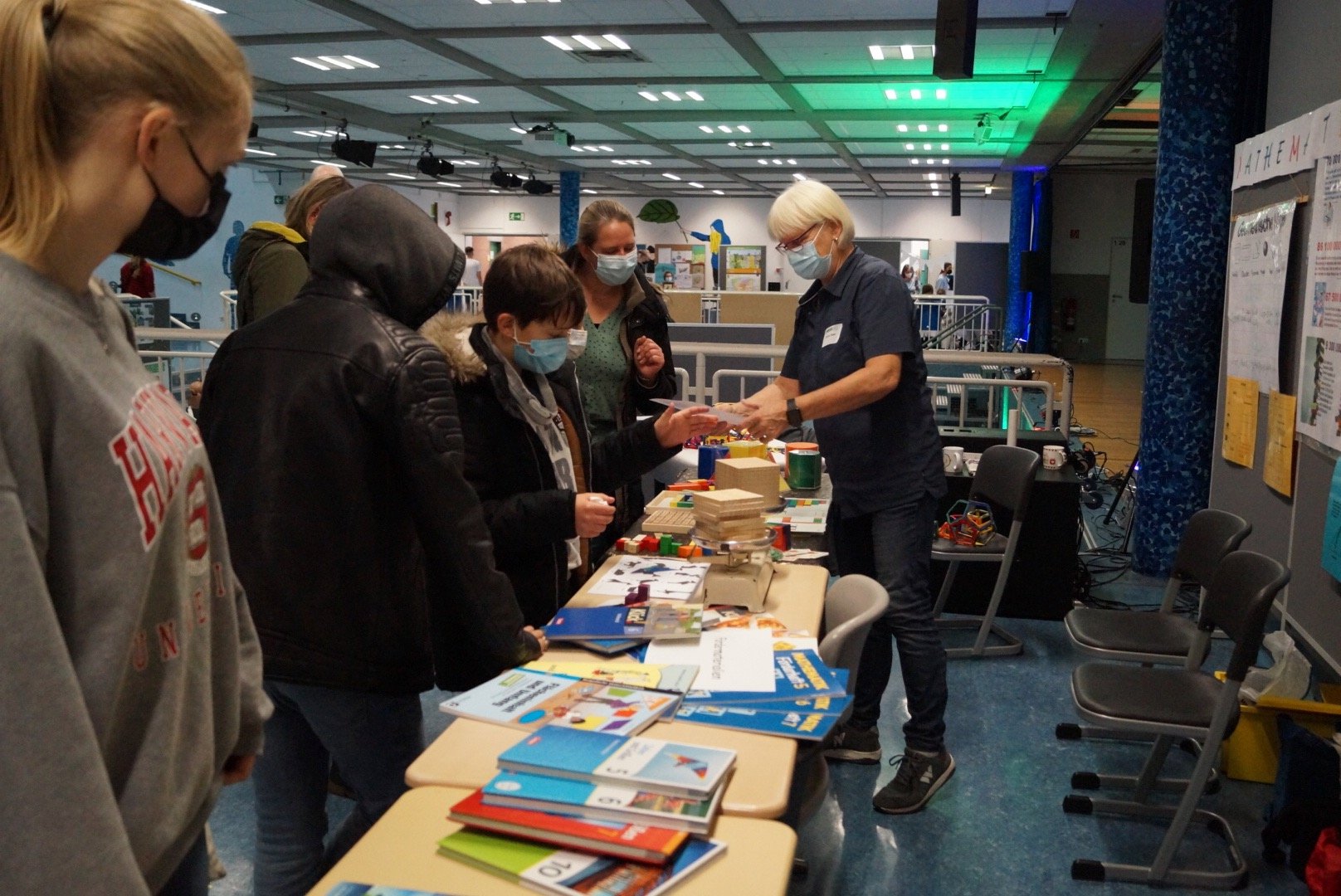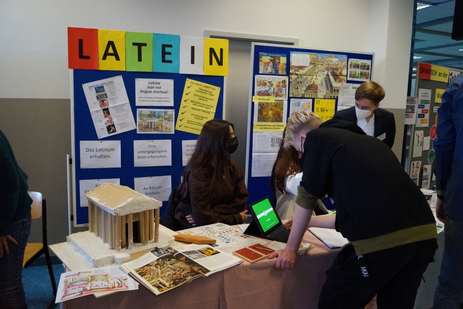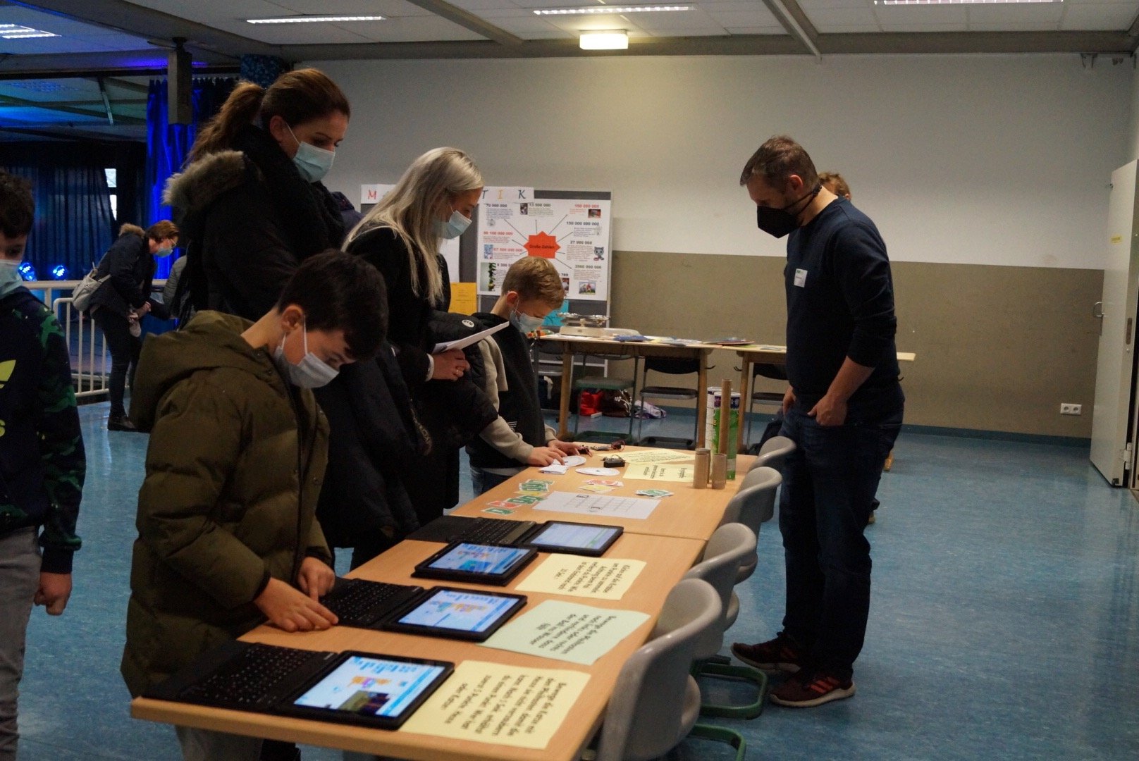 Die Lotsen aus dem 10. Jahrgang begleiteten die Besucher:innen durch die Schule, erläuterten die Räumlichkeiten und standen für Fragen jeglicher Art bereit. In diesem Jahr gab es zusätzlich eine neue Art, die Schule zu erkunden, eine digitale Schnitzeldjagd. Bei der Einlasskontrolle erhielt jeder, der mochte, einen Laufzettel für die digitale Schnitzeljagd, die die Kinder und Eltern einmal kreuz und quer durch das Schulgebäude führte. An zahlreichen Ständen und in Fachräumen konnten die Besucher:innen sich informieren und dann an iPads Quizfragen beantworten. Dann erhielten sie ein Lösungswort und zogen weiter zum nächsten „Quizort“ bis sie schließlich bei der Schülervertretung ihren Lösungssatz einreichen konnten und mit einem kleinen Preis belohnt wurden.