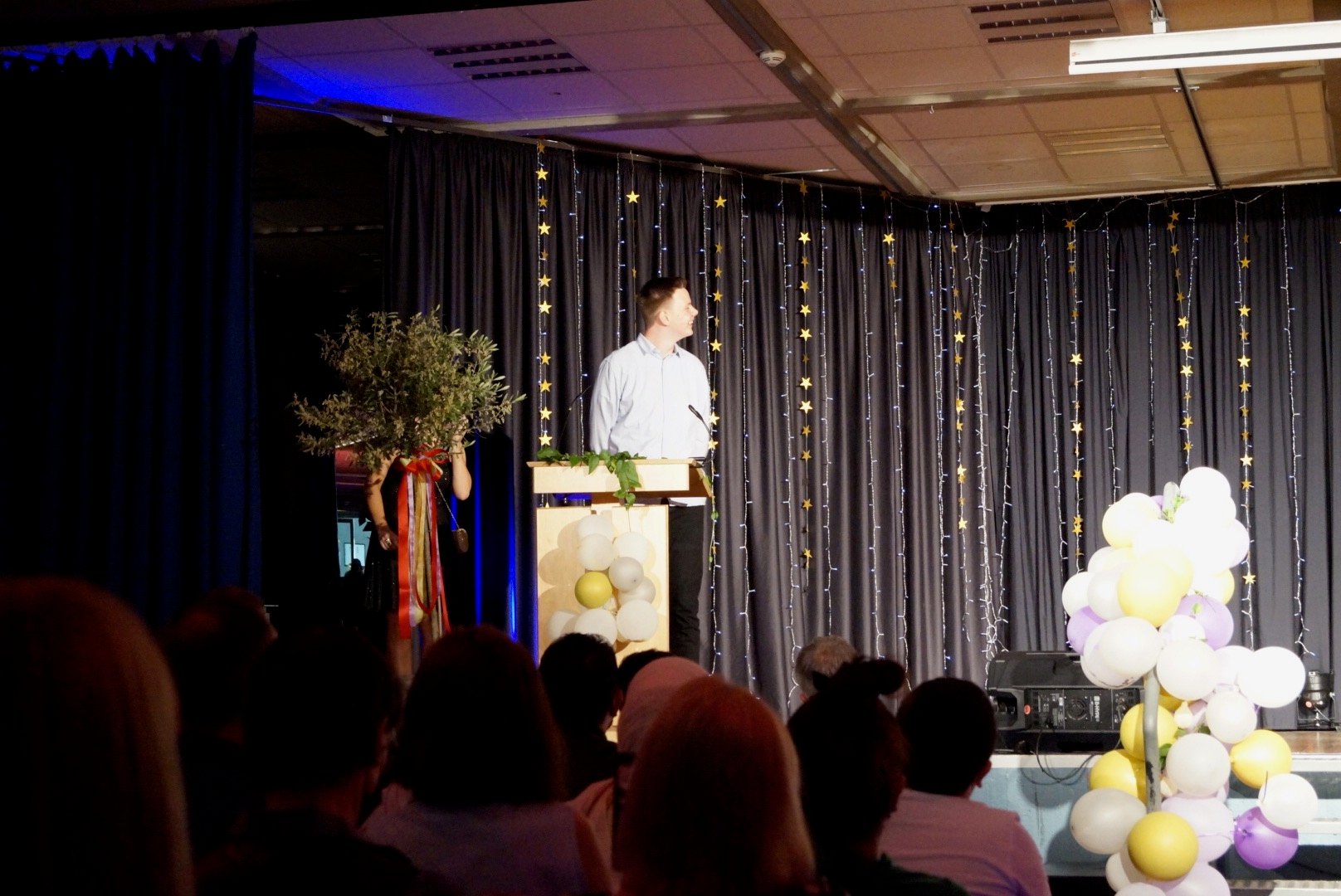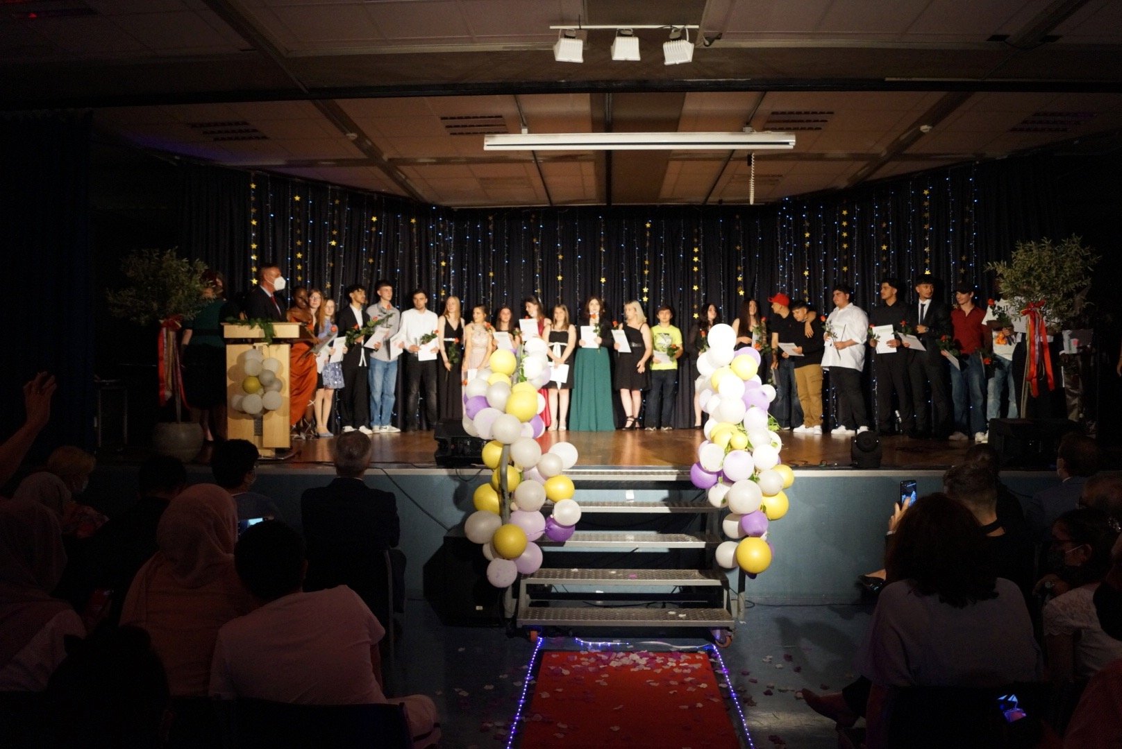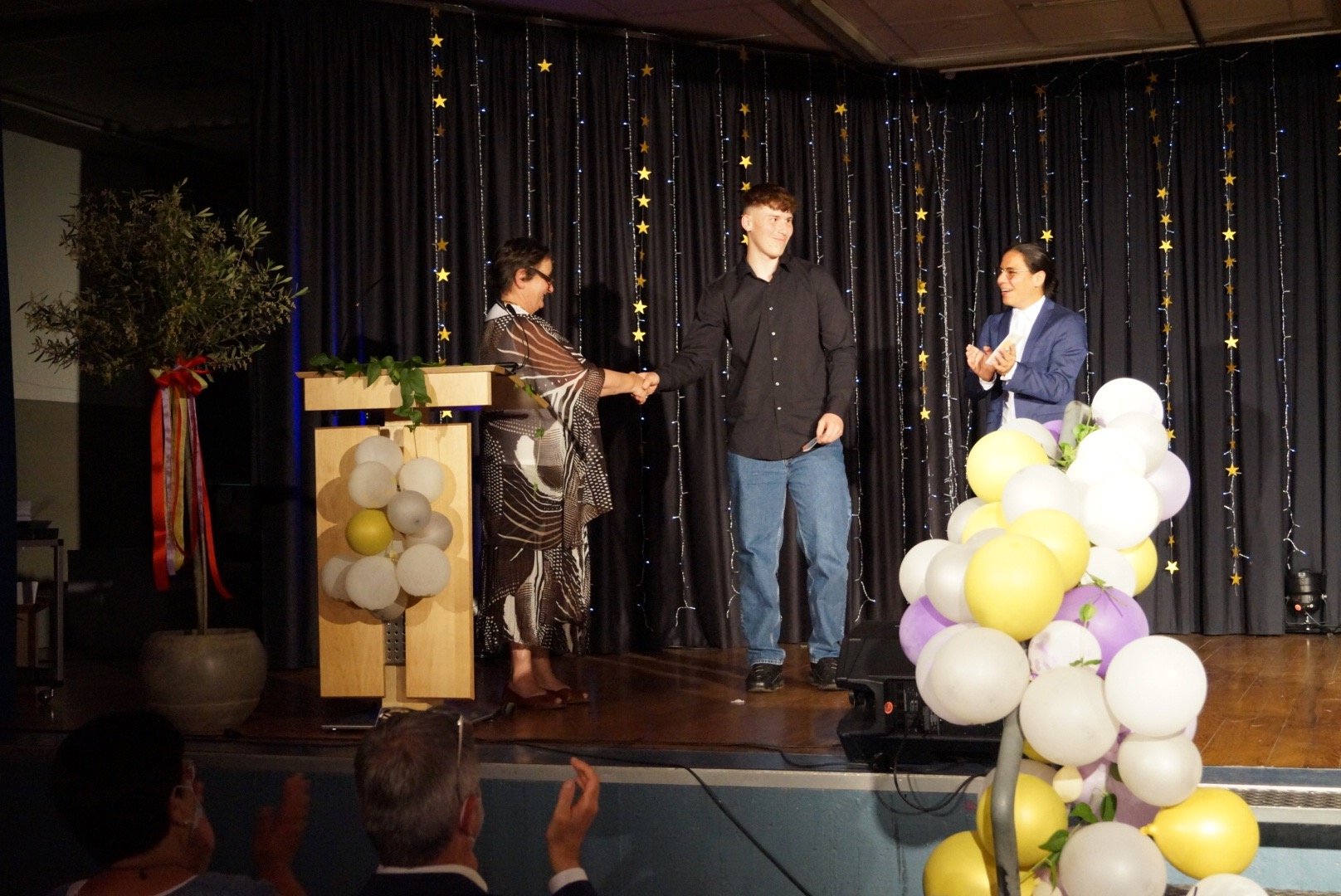 Die letzte Rede kam von den Klassenlehrer*innen des 10. Jahrgangs, die ihre Wünsche für die Schüler*innen in Form großer Buchstaben vortrugen, etwa Ausdauer, Toleranz, Unrechtsbewusstsein, etc. Am Ende ergaben ihre Wünsche dann ein ‚ALLLES GUTE!‘ bevor alle Klassen nacheinander auf der Bühne ihre Zeugnisse erhielten.