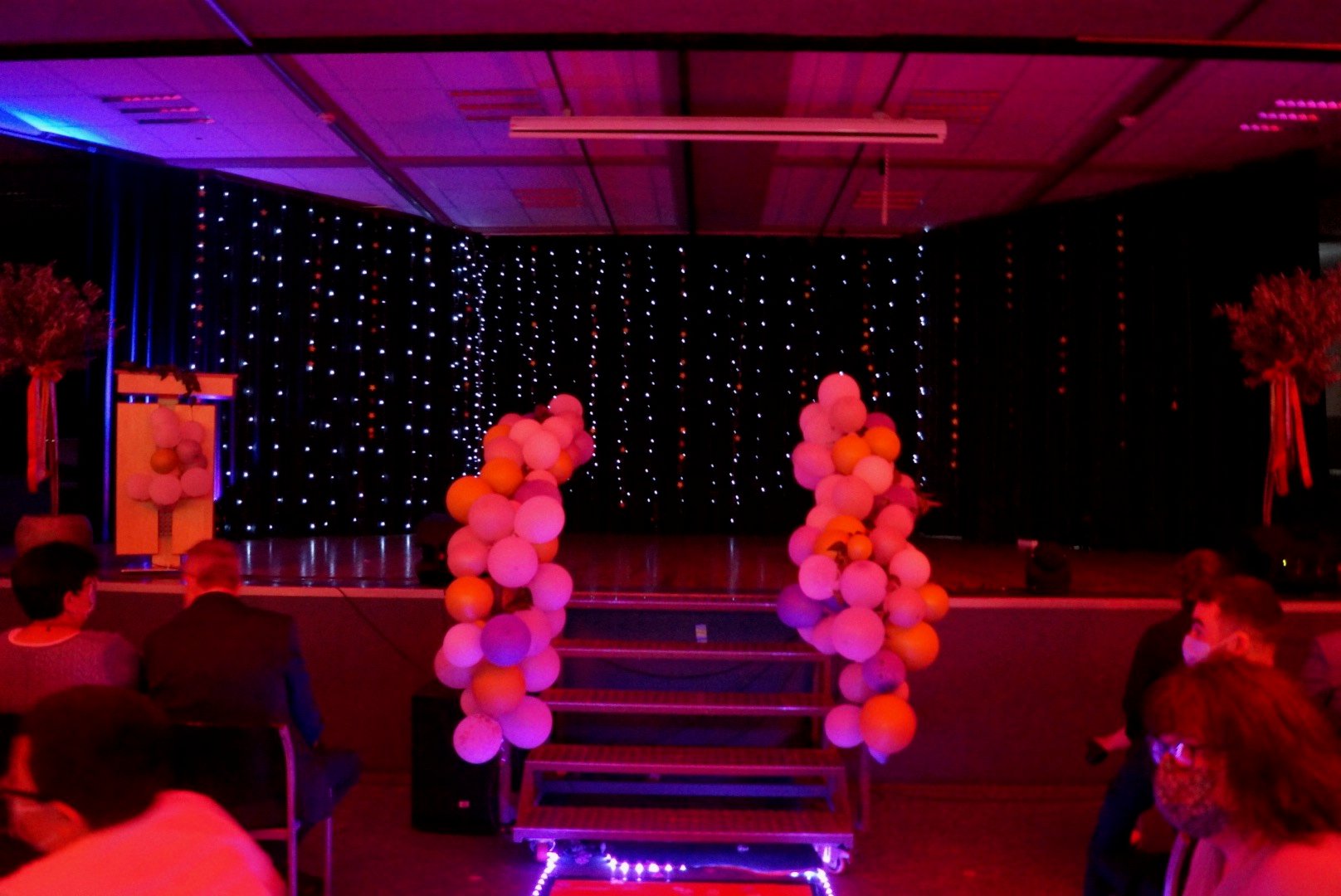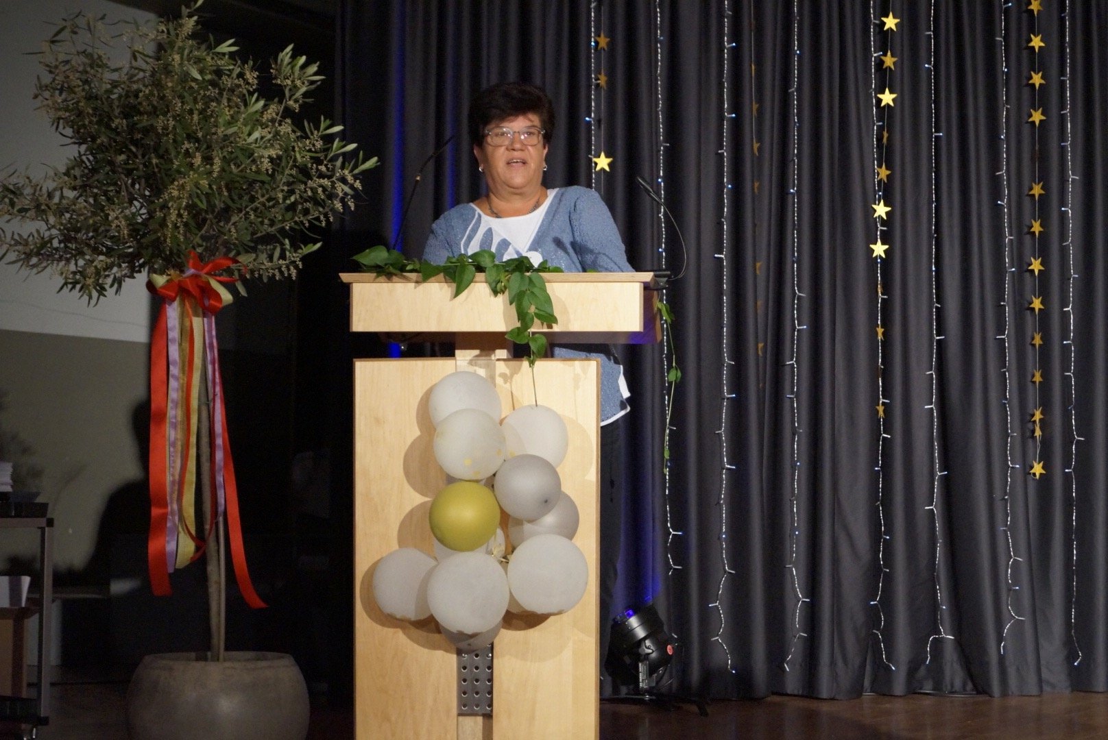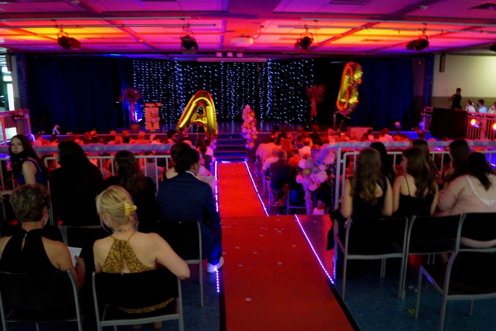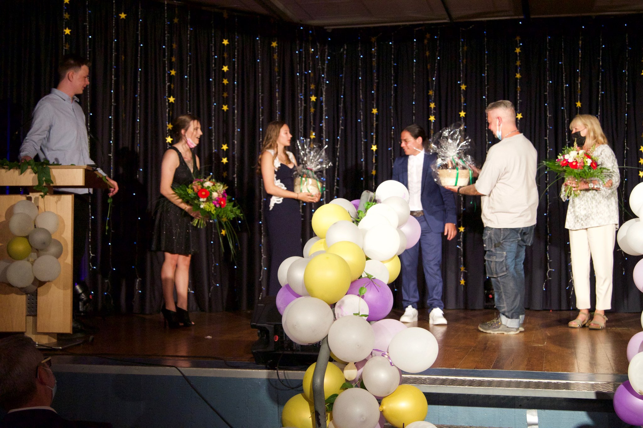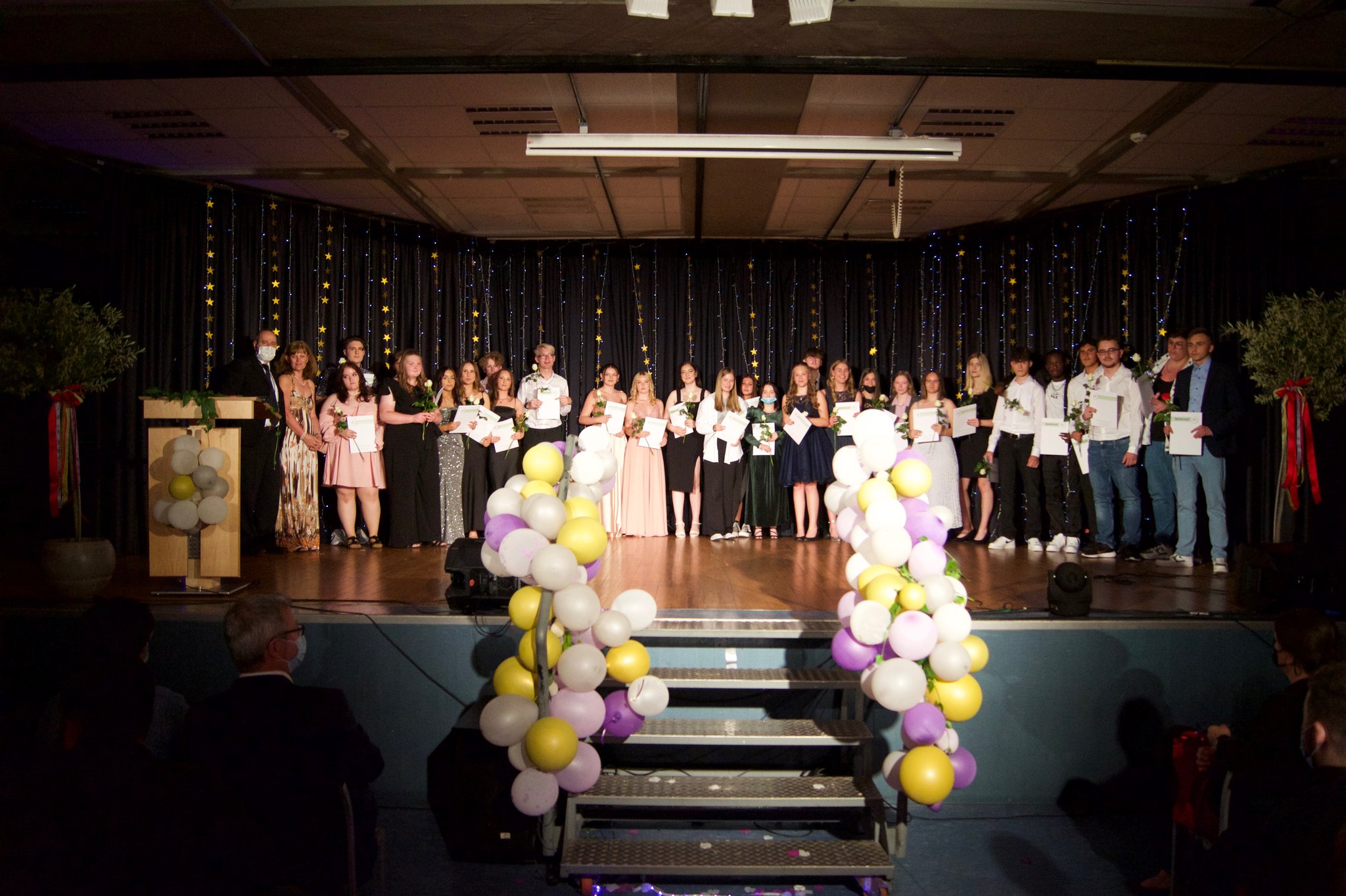 Natürlich durfte auch die Rede der Abteilungsleiterin Frau Beckmann nicht fehlen, die Herausforderungen jeglicher Art in ihrer Ansprache thematisierte. Neben diesem ernsten Thema, wurde ihr aber auch die Freude zuteil, die drei Schüler*innen mit dem jeweils besten Abschluss zu ehren. Nachdem Frau Pieta als Vorsitzende des Fördervereins den Absolvent*innen gratuliert und ihnen ein Geschenk übergeben hatte, folgte die Schüler*innenrede von Kira und Marc. Gemeinsam mit den Moderator*innen bedankten sie sich auch bei den Helfer*innen aus der zweiten Reihe: den Sekretärinnen und Schulhausmeistern, die immer ansprechbar waren, wenn es mal ‚brannte‘.
