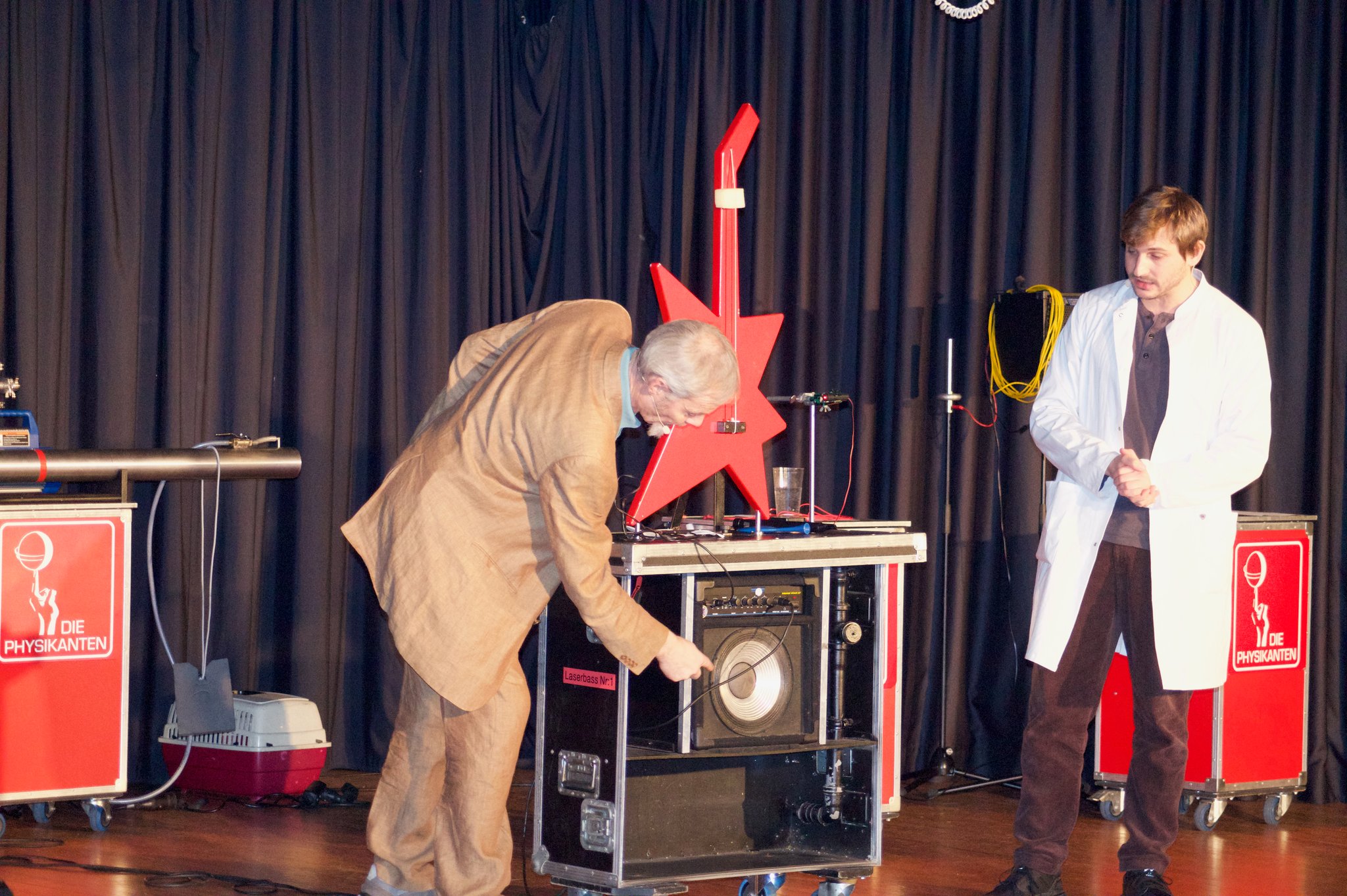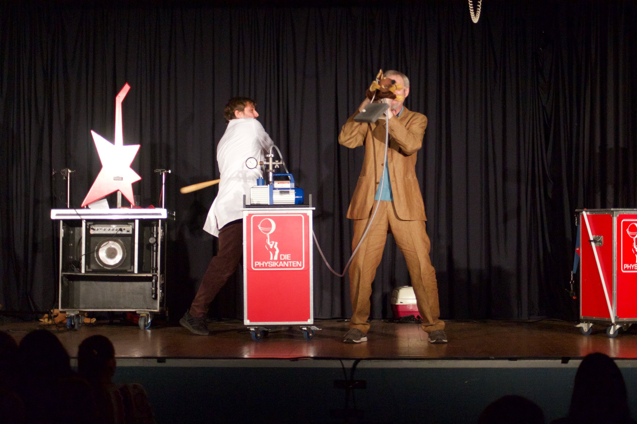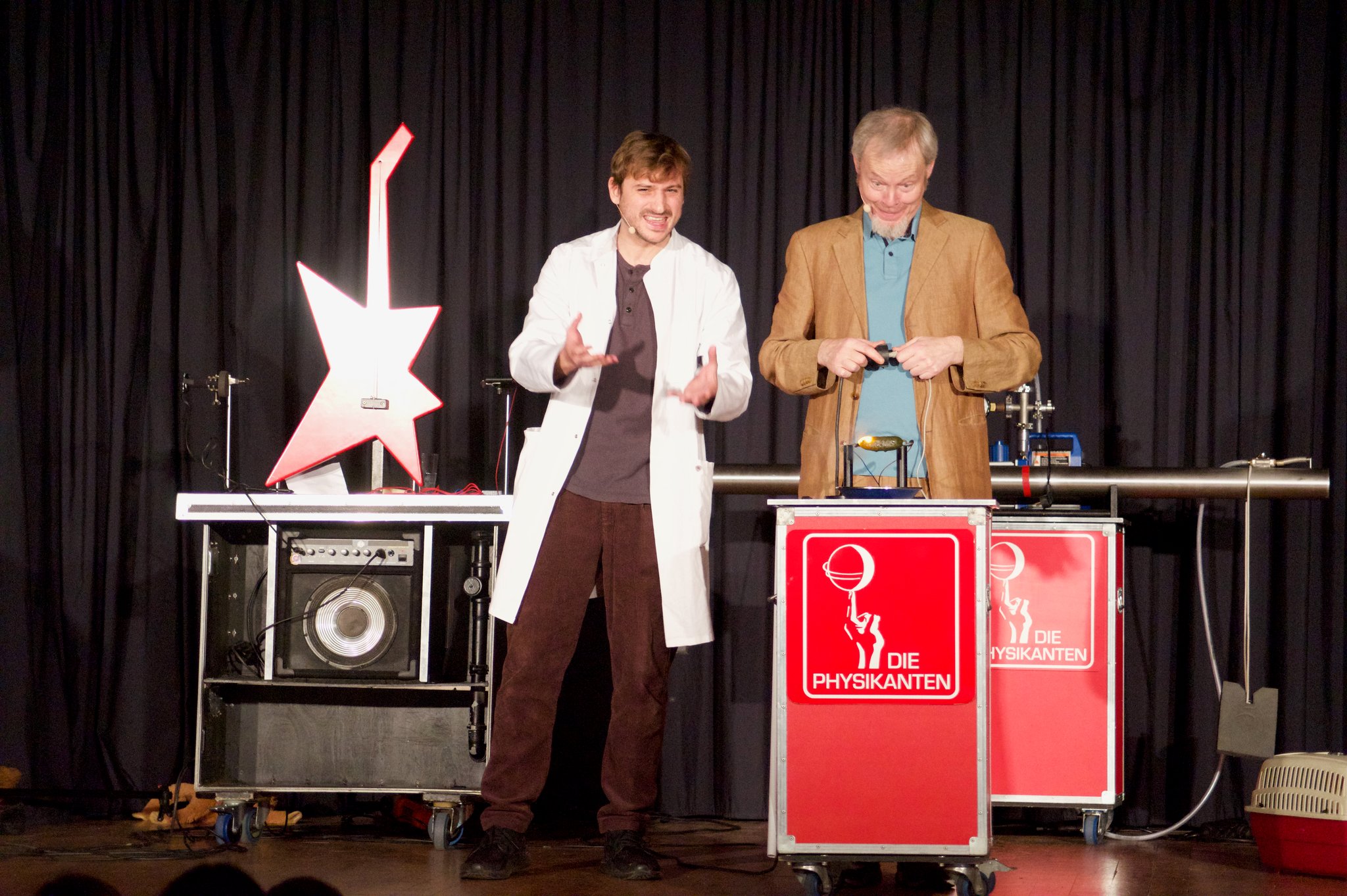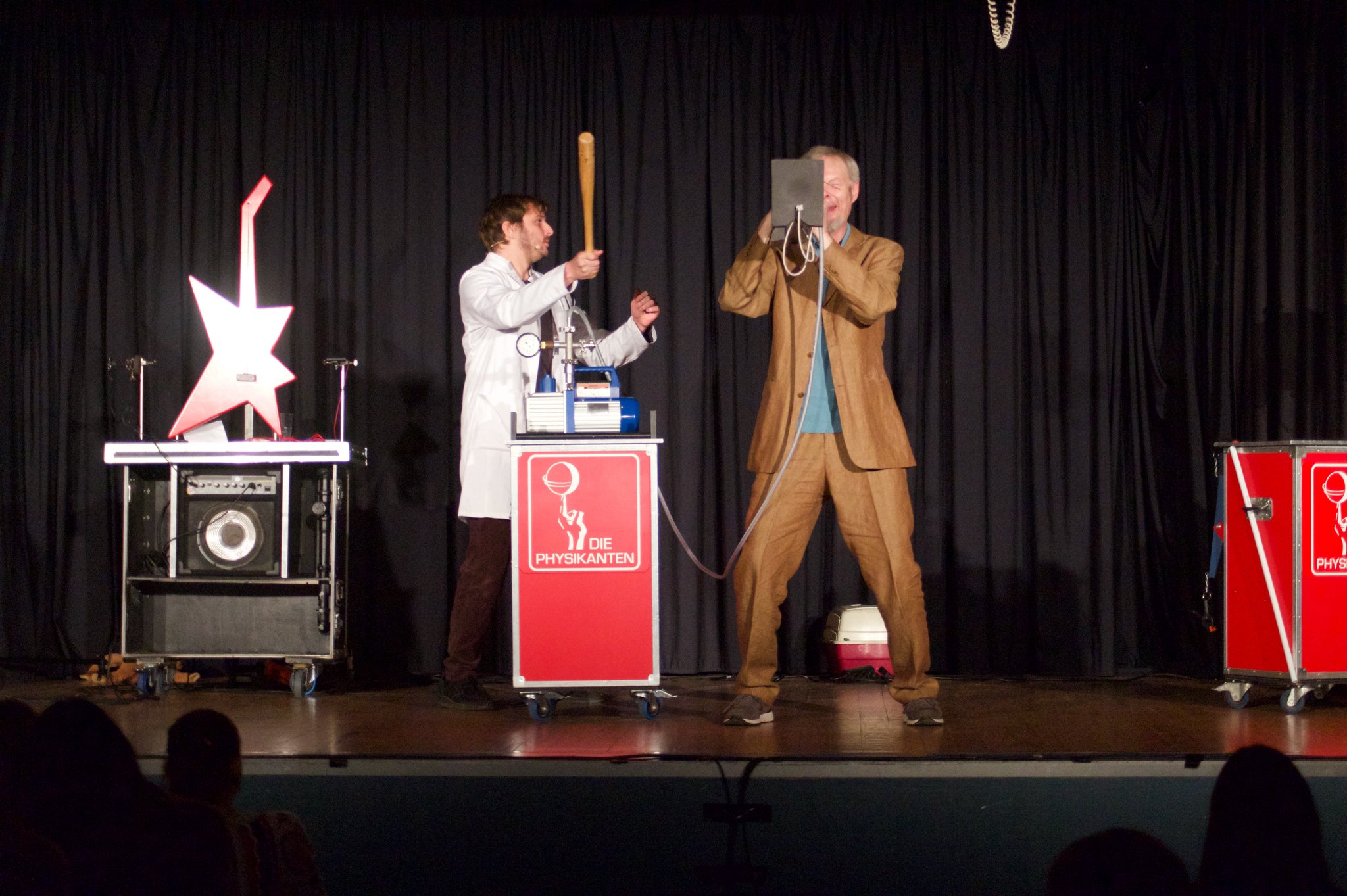 Showmaster Rainer Grünebaum hatte das Publikum mit seinem Humor und seinen Scherzen schnell für sich gewonnen und zeigte zu Beginn ein Experiment zur Zentrifugalkraft, indem er ein Glas Wasser rotierend über die Bühne schwang. Währenddessen besprach er mit den Schülerinnen und Schülern den Effekt der Fliehkraft, der ihnen allen vom Karussell auf der Kirmes bekannt ist. Bald schon erhielt er Unterstützung von seinem Kollegen, dem etwas ernsthafteren Professor Liebermann.
