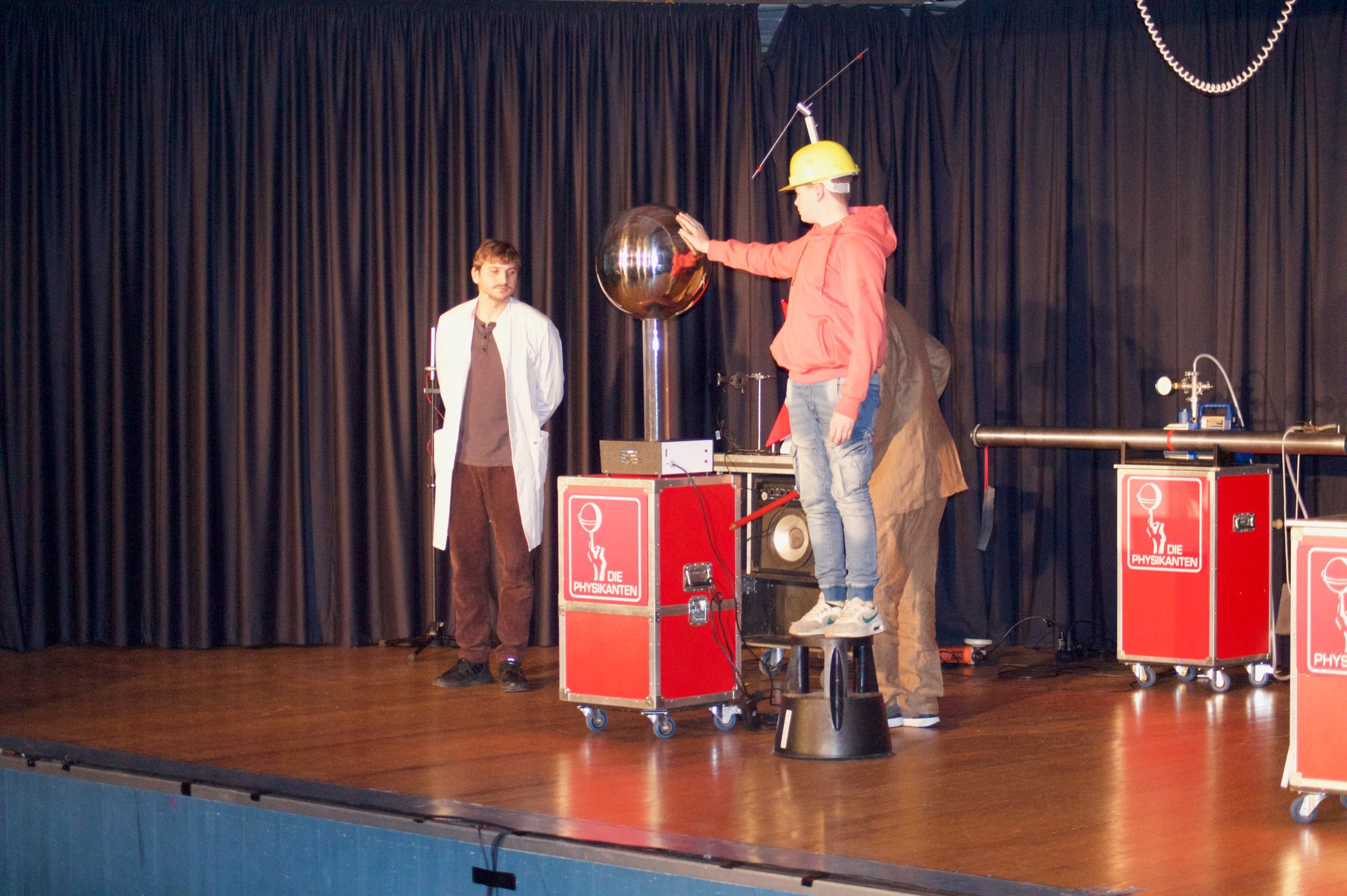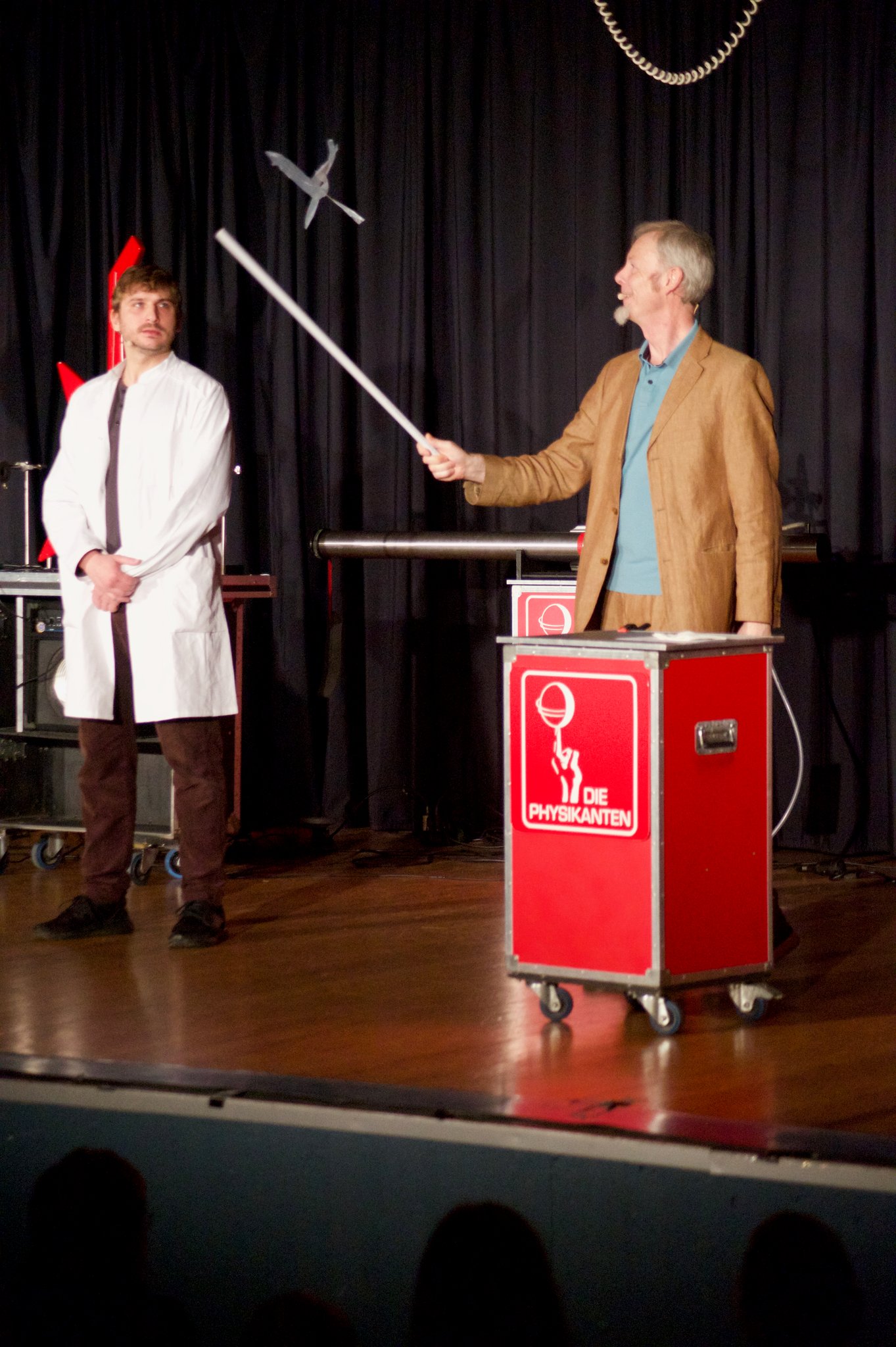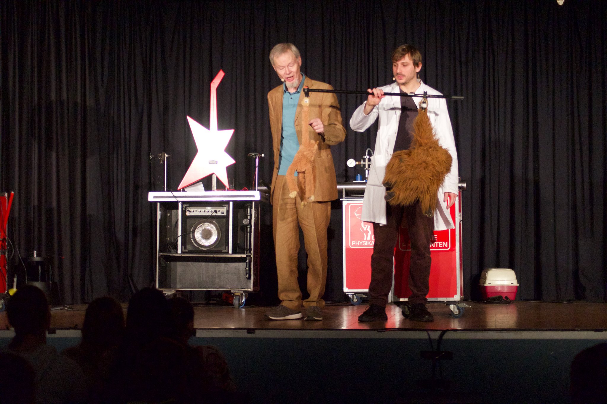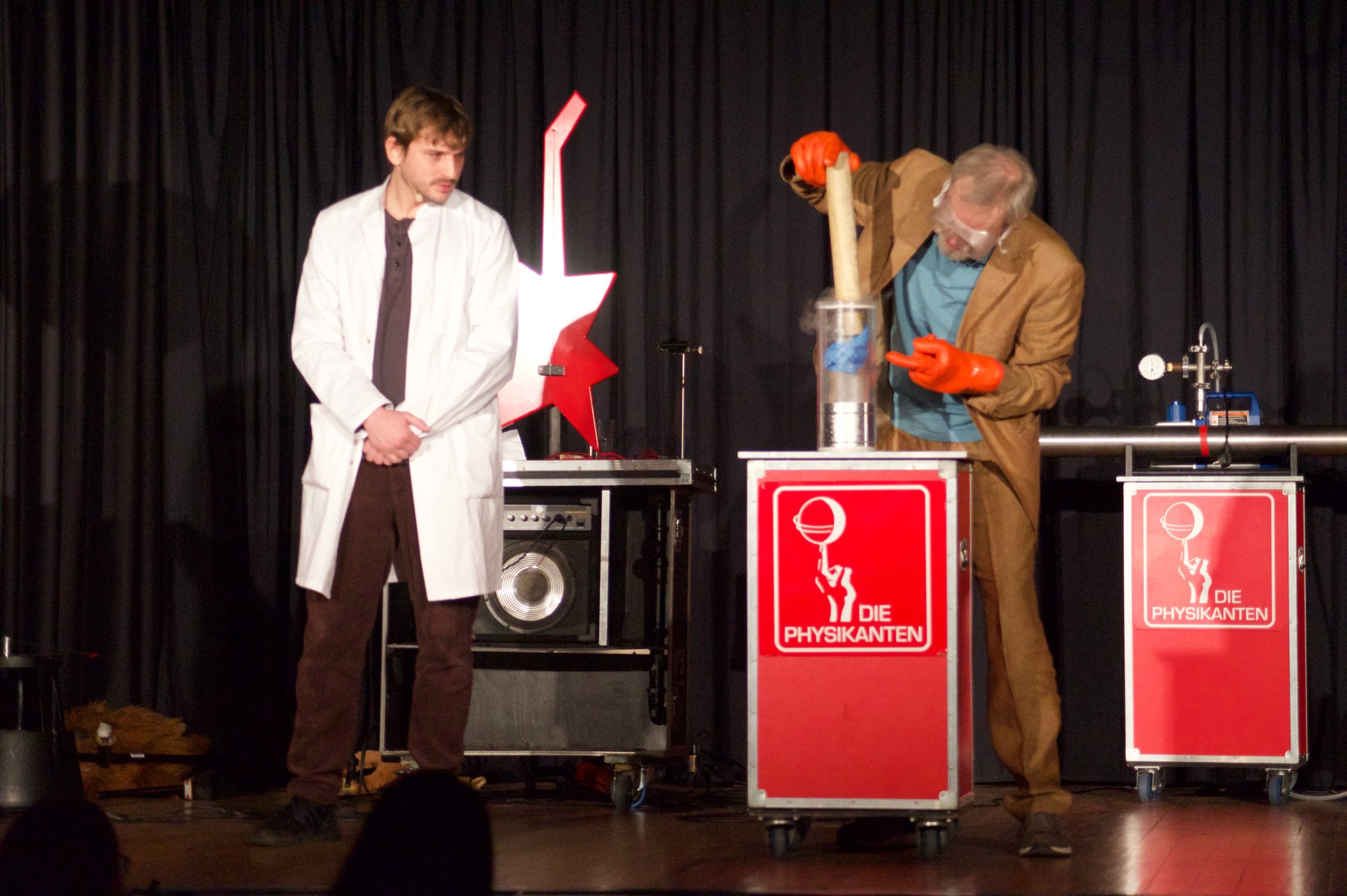 Showmaster Rainer Grünebaum hatte das Publikum mit seinem Humor und seinen Scherzen schnell für sich gewonnen und zeigte zu Beginn ein Experiment zur Zentrifugalkraft, indem er ein Glas Wasser rotierend über die Bühne schwang. Währenddessen besprach er mit den Schülerinnen und Schülern den Effekt der Fliehkraft, der ihnen allen vom Karussell auf der Kirmes bekannt ist. Bald schon erhielt er Unterstützung von seinem Kollegen, dem etwas ernsthafteren Professor Liebermann.