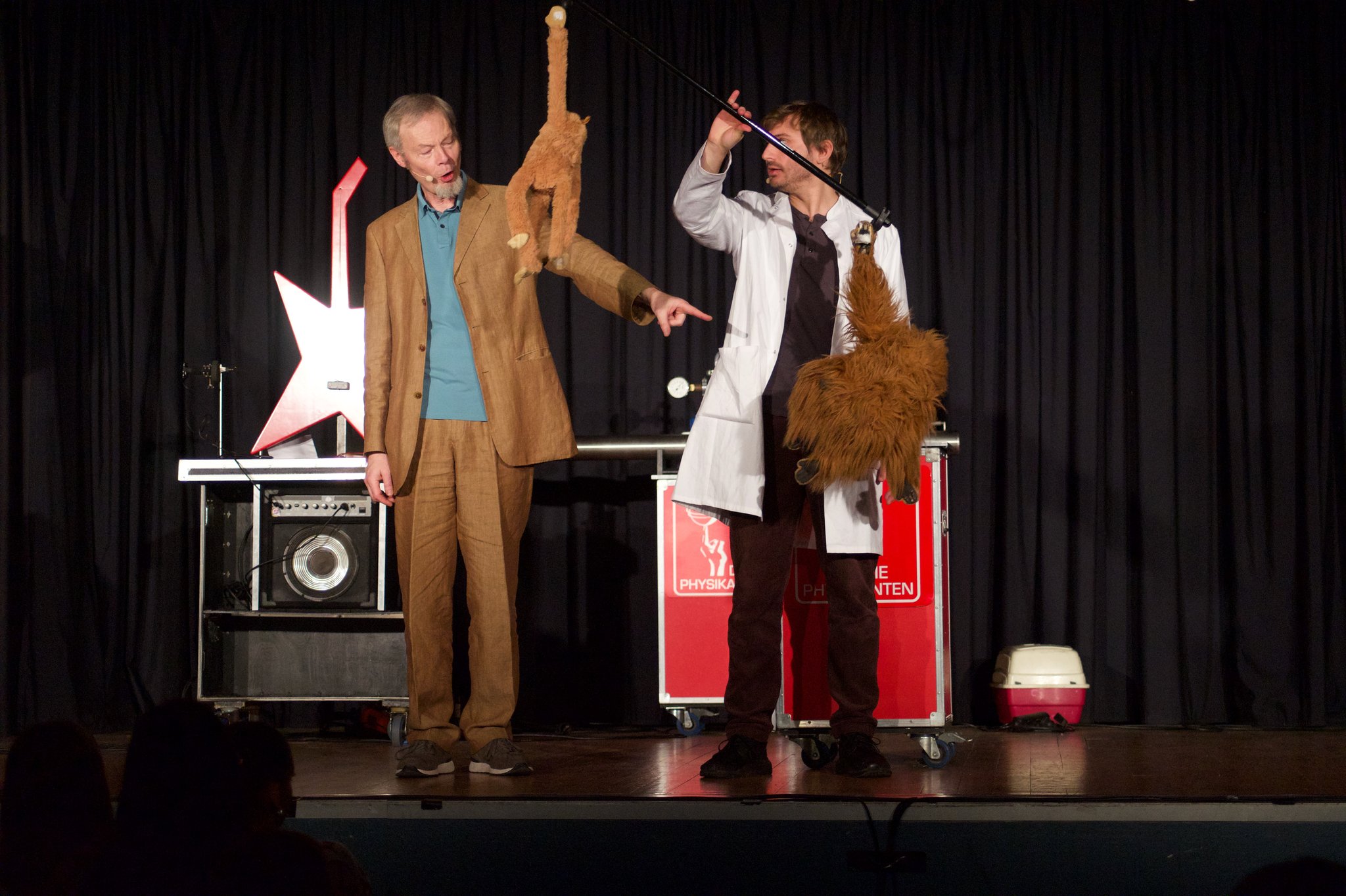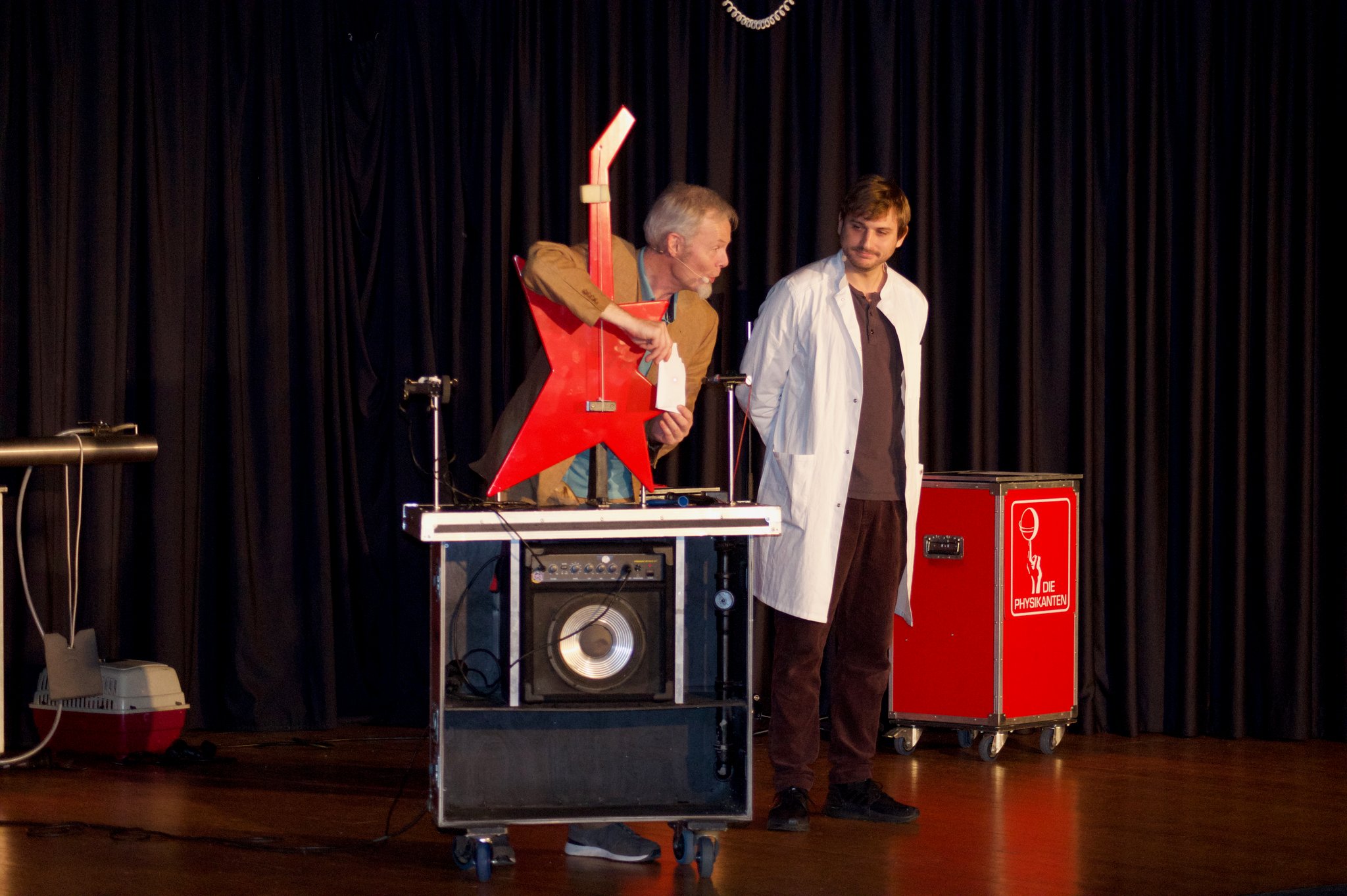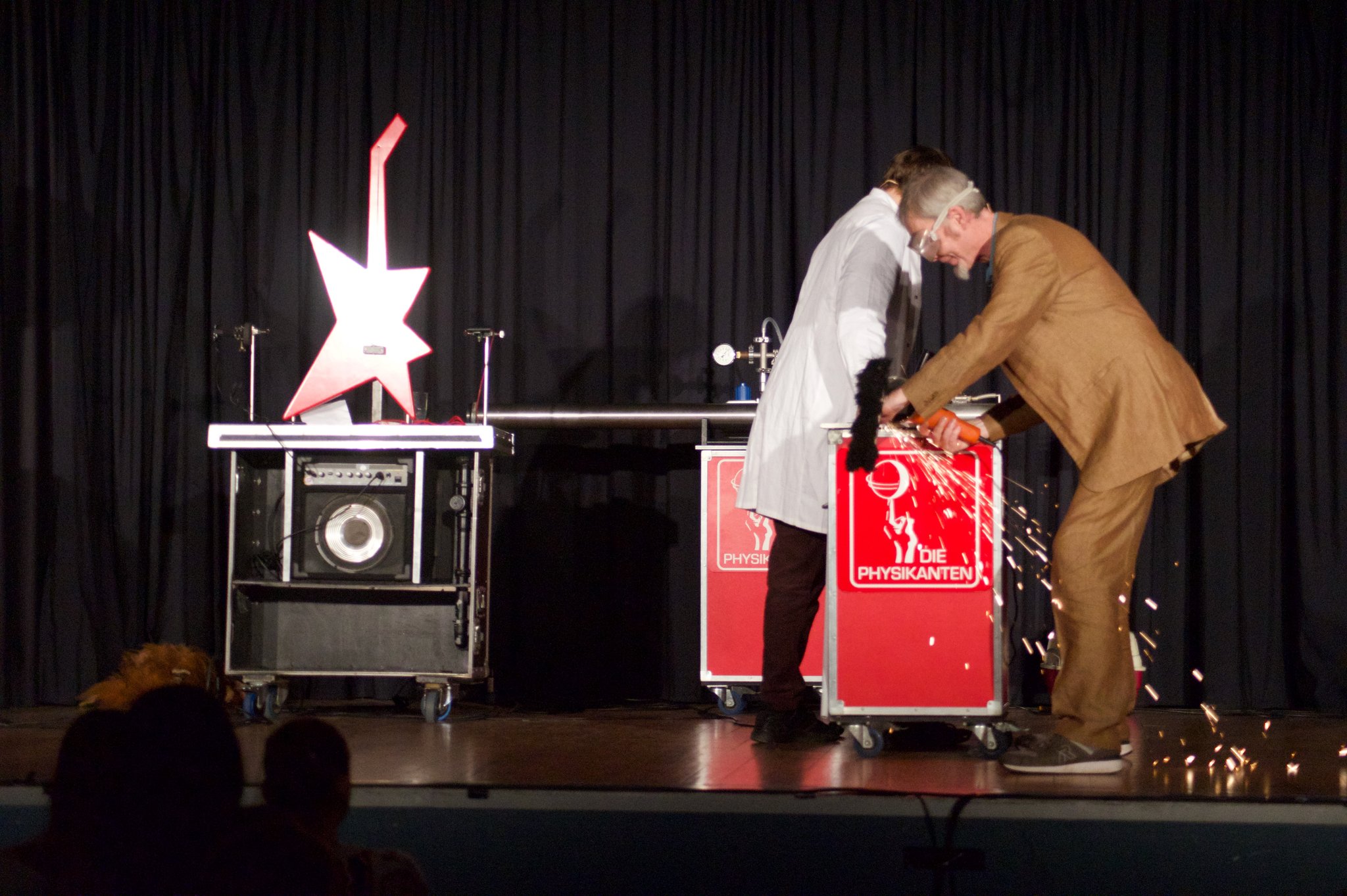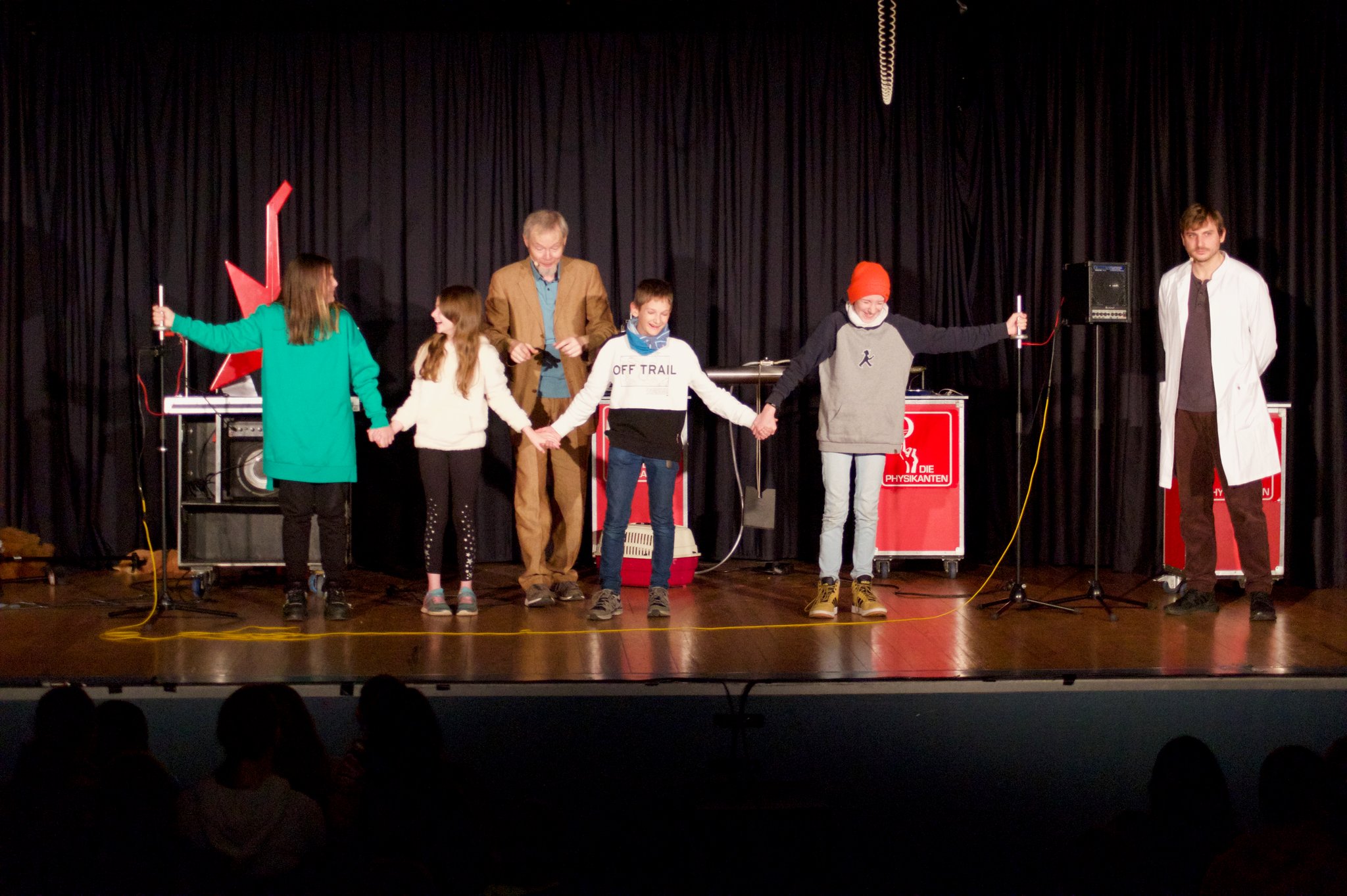 Showmaster Rainer Grünebaum hatte das Publikum mit seinem Humor und seinen Scherzen schnell für sich gewonnen und zeigte zu Beginn ein Experiment zur Zentrifugalkraft, indem er ein Glas Wasser rotierend über die Bühne schwang. Währenddessen besprach er mit den Schülerinnen und Schülern den Effekt der Fliehkraft, der ihnen allen vom Karussell auf der Kirmes bekannt ist. Bald schon erhielt er Unterstützung von seinem Kollegen, dem etwas ernsthafteren Professor Liebermann.