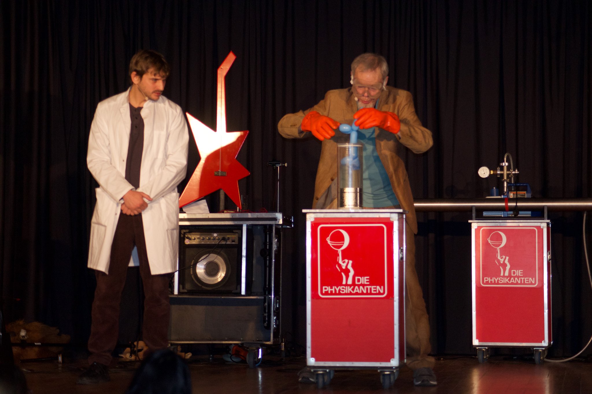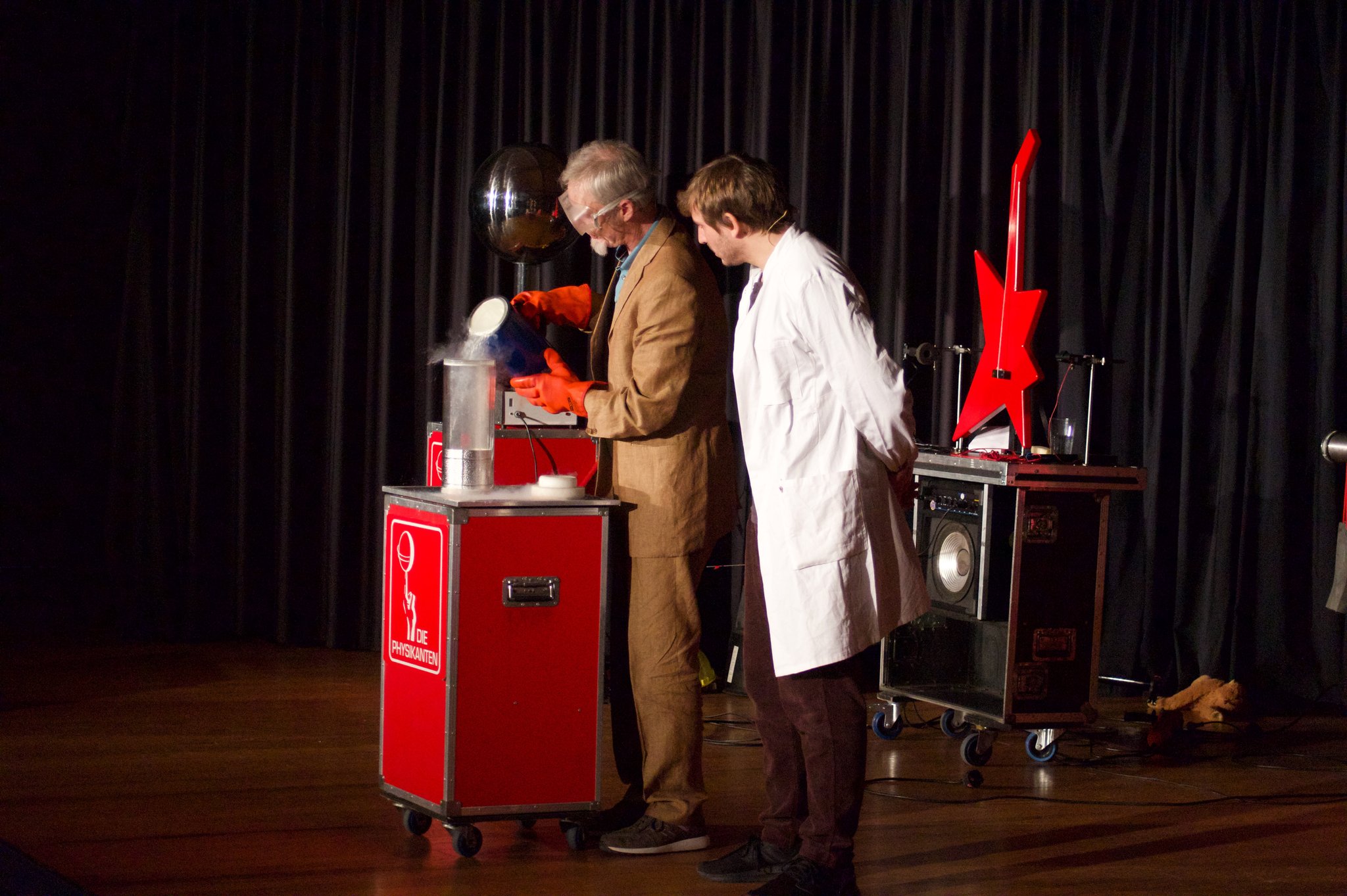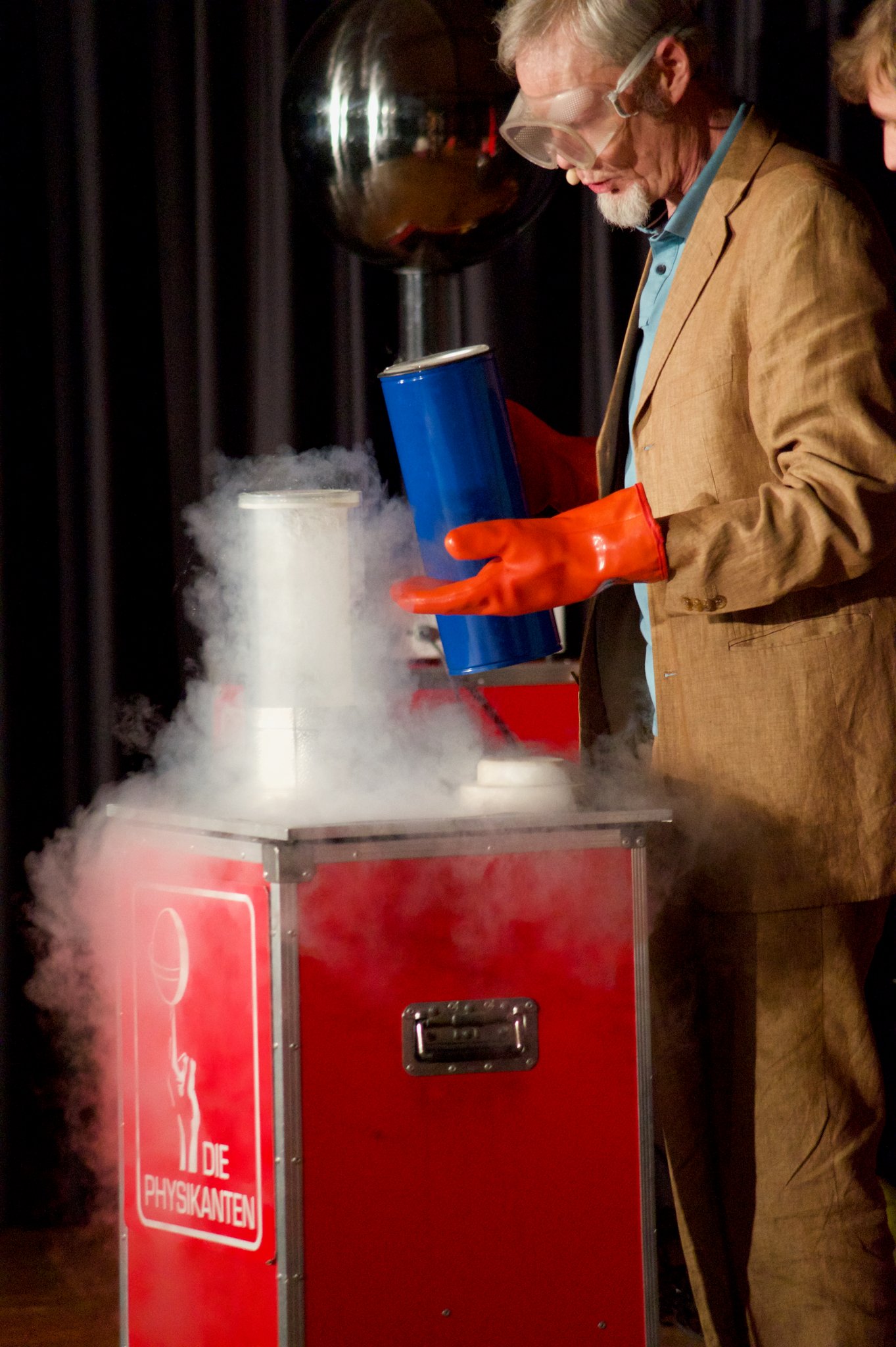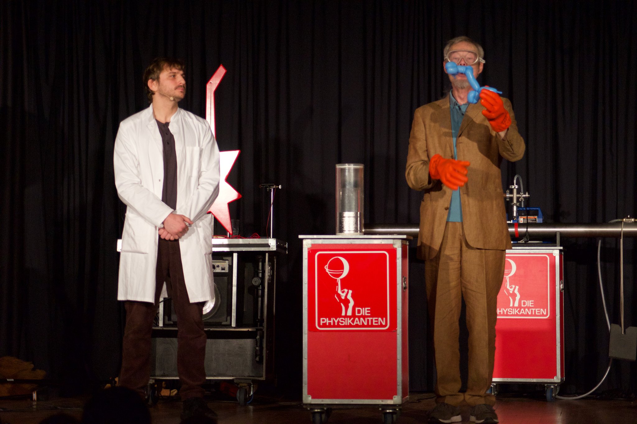 Professor Liebermann und der Showmaster zeigten Experimente zur Elektrostatik, zum Schwerpunkt und zum Stromleiten durch Menschen, oft mit Unterstützung des Publikums, das nur allzu gerne mutig aushalf. Fasziniert waren die Kinder und Jugendlichen insbesondere als ein Luftballonhund in flüssigem Stickstoff auf Reisegröße gebracht wurde: durch den kalten Stickstoff wird die Luft flüssig und der Ballon fällt zusammen. Nimmt man ihn heraus und er erwärmt sich, dehnt er sich aus und nimmt seine alte Form wieder an.