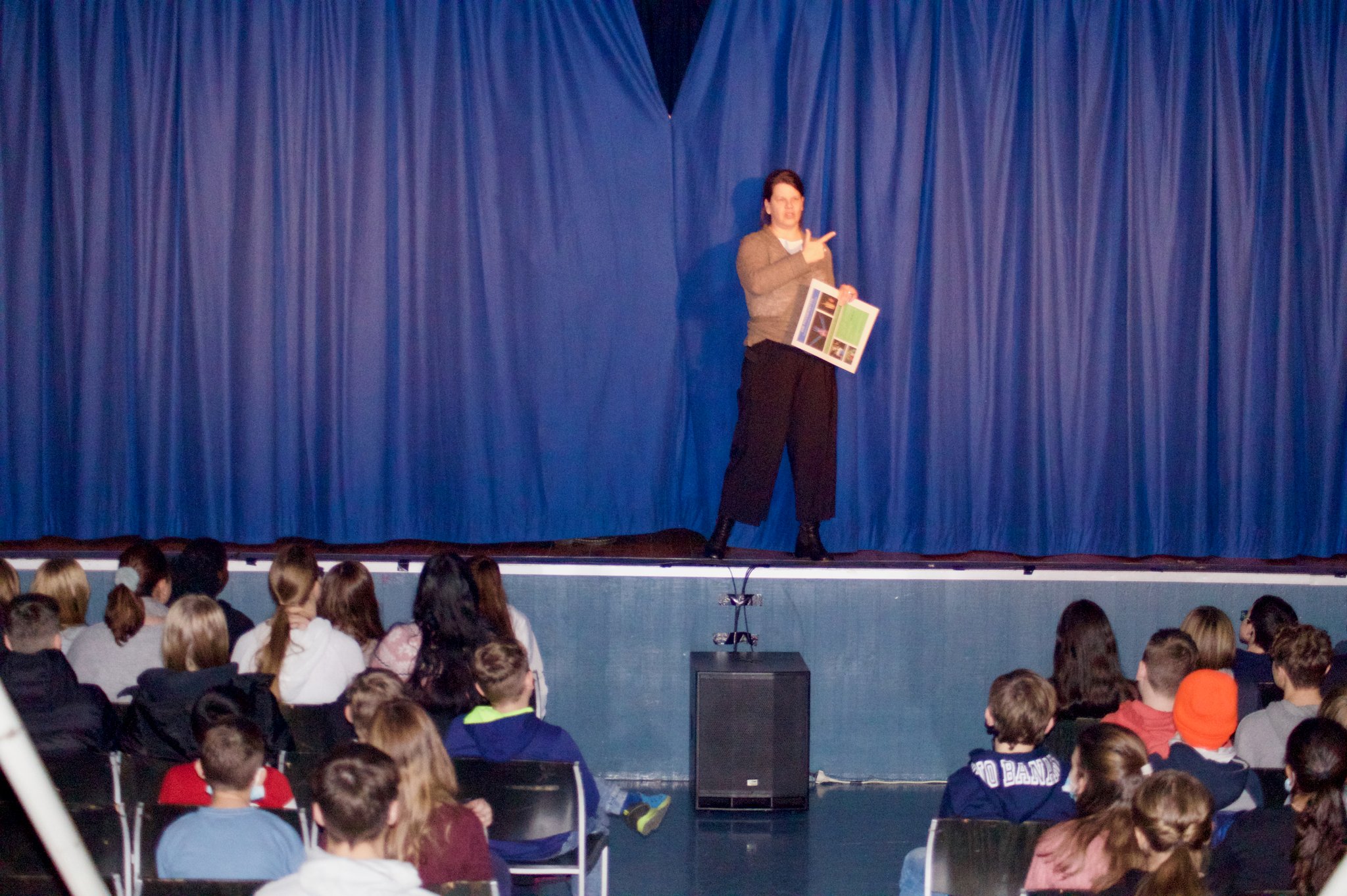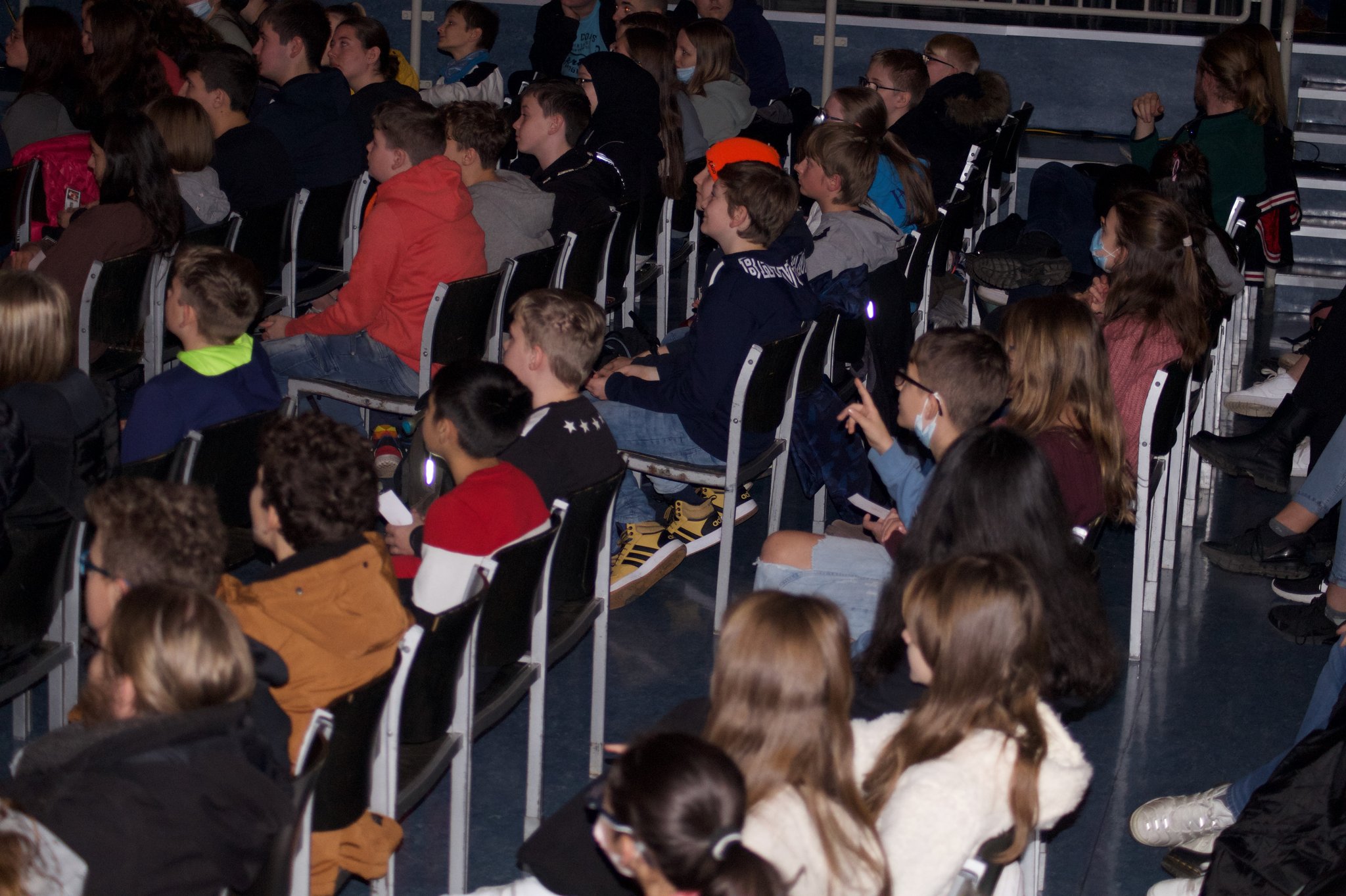 Zunächst betrat Frau Schönwald die Bühne, begrüßte alle Schülerinnen und Schüler und beglückwünschte sie zur erbrachten Leistung und den gewonnenen Tickets. Sie wünschte den Anwesenden viel Spaß und dann ging es auch schon los mit der Show.