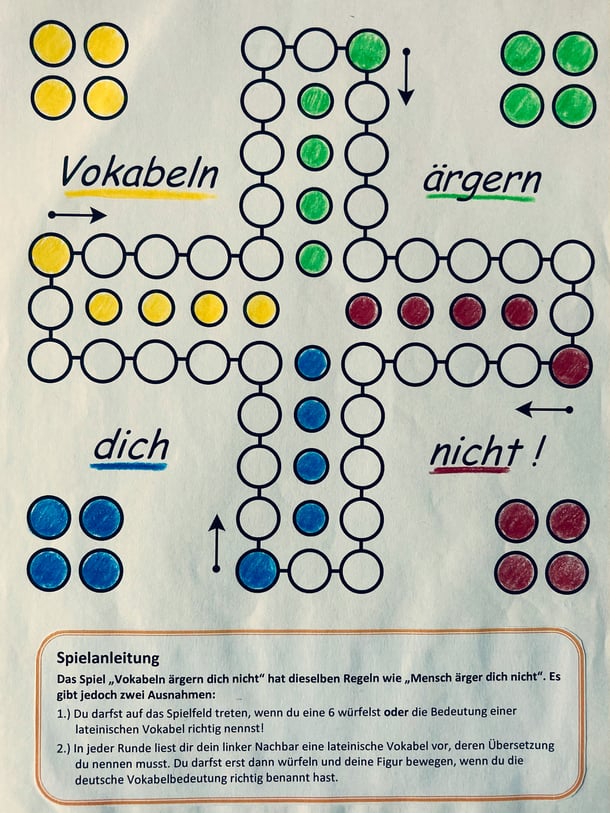Deine Lateinlehrer an der Waldschule versuchen so oft wie möglich ein spielerisches Lernen zu ermöglichen: So kannst du beispielsweise Vokabeln in einer lateinischen Version von „Mensch, ärgere dich nicht“ trainieren.