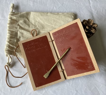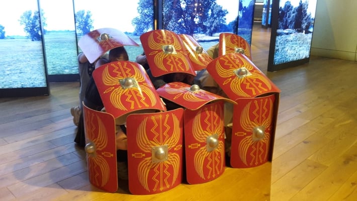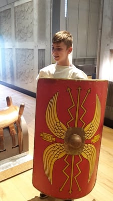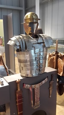 Danach mussten unsere zwei Gruppen zu ihrem Workshop zurück. Eine Gruppe hat dort ein Wachstäfelchen gebaut, wie sie die Römer benutzten, um darauf zu schreiben. Wenn man das Wachs erwärmt, wird die Fläche wieder glatt und man kann es immer wieder benutzen. Die zweite Gruppe hat eine Legionärsführung gemacht. Wir durften eine nachgebaute Rüstung von Legionären und ihre Helme anziehen und haben vieles über den Alltag und aus dem Leben der Legionäre erfahren.