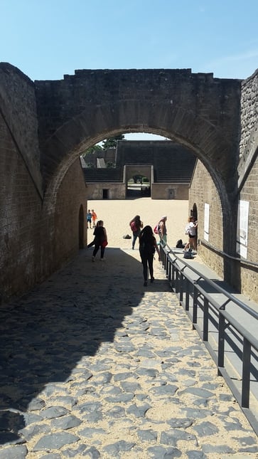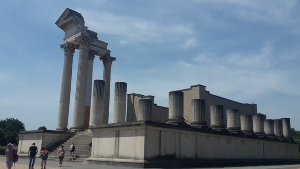 Die Schüler*innen und Lehrer trafen sich gemeinsam am Eschweiler Hauptbahnhof und fuhren dann mit dem Zug in Richtung Duisburg. Dort stiegen wir in den Zug um, der schließlich in Richtung Xanten fuhr. Vom Bahnhof in Xanten liefen wir zusammen zum Römerpark. Auf dem Weg zum Römerpark haben wir alte Römerwege gesehen und die Fundamente alter Häuser. Der Weg zum Park wurde anstrengend aufgrund der Hitzewelle – es war der heißeste Tag des Jahres.